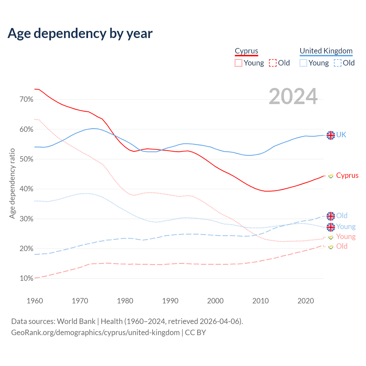 The share of older people aged 65 and over is 14.6% in Cyprus and 19.5% in the United Kingdom. Life expectancy in Cyprus compared to the United Kingdom .