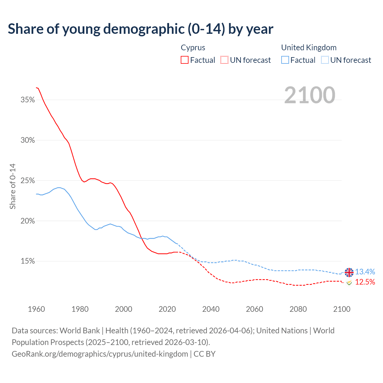 - The share of young demographic (0-15 years old) in Cyprus is 16.1% vs 17.2% in the United Kingdom.