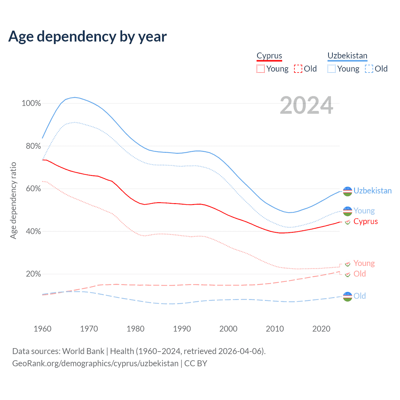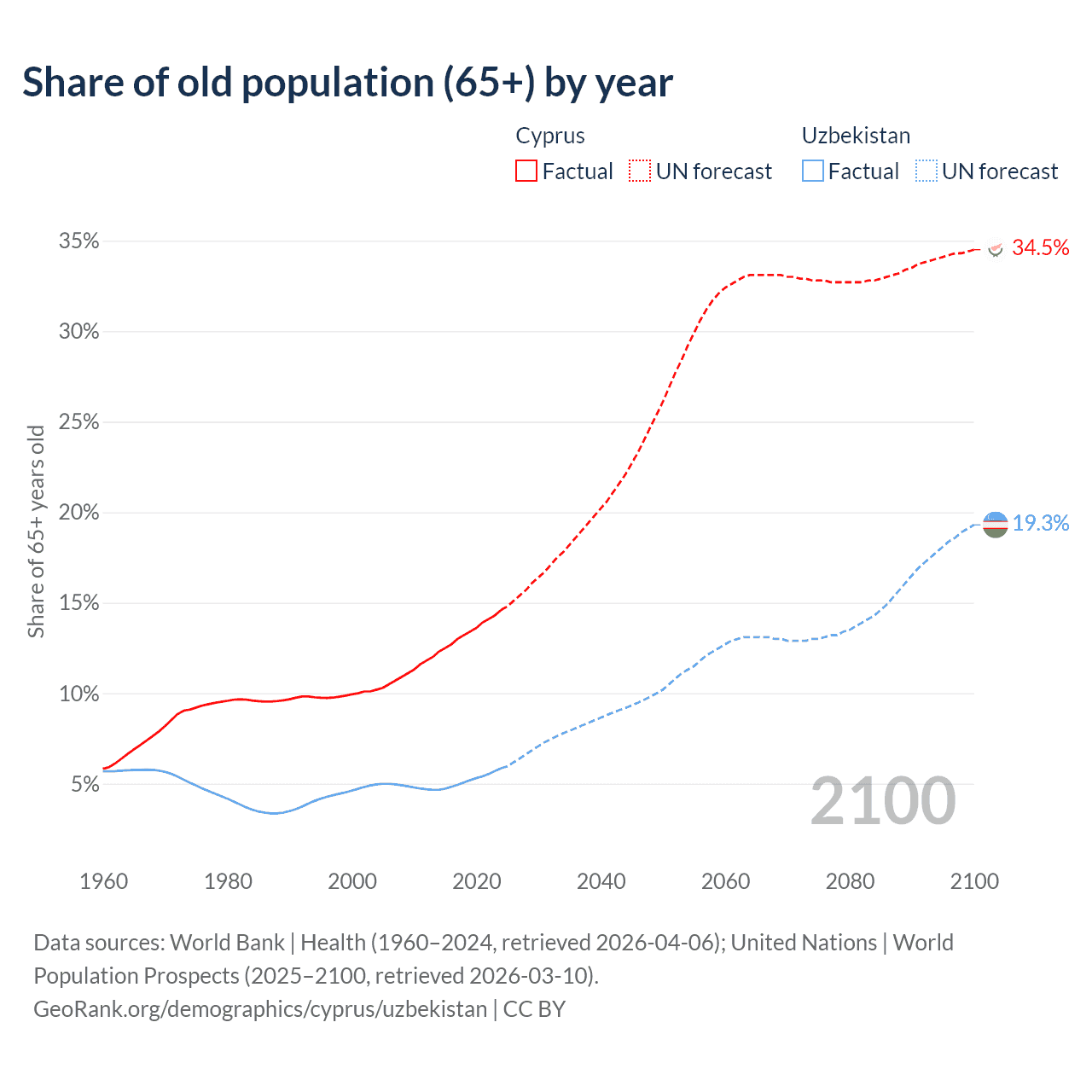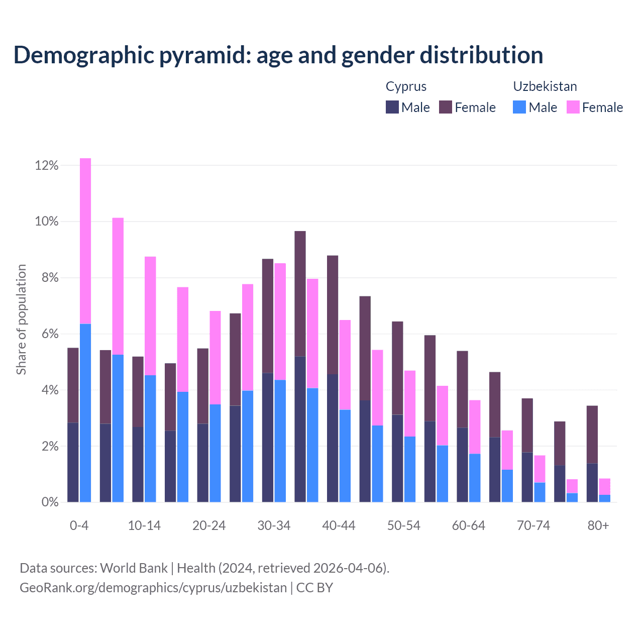 The share of older people aged 65 and over is 14.6% in Cyprus and 5.86% in Uzbekistan. Life expectancy in Cyprus compared to Uzbekistan .