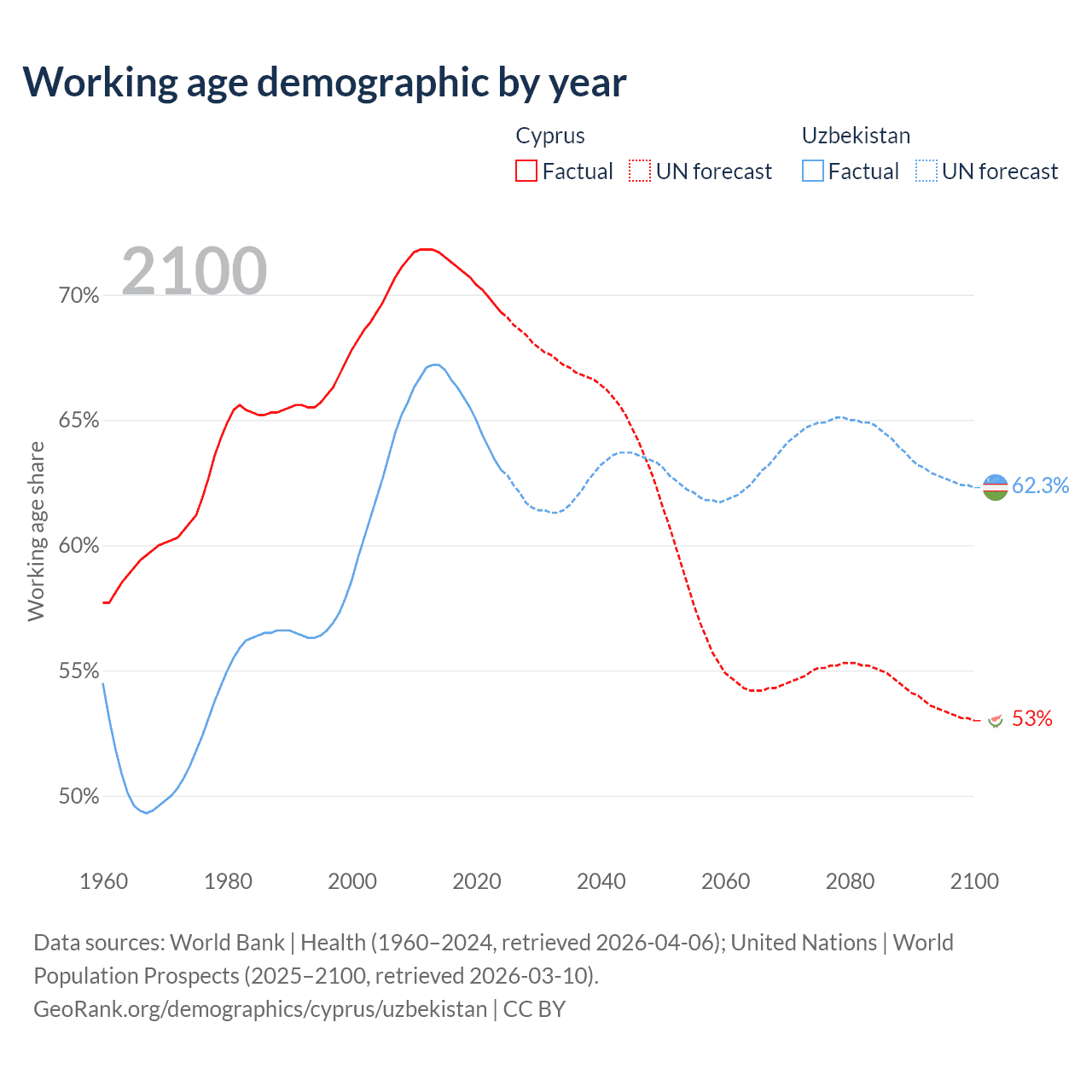 Median age Cyprus vs Uzbekistan, 1960-2100