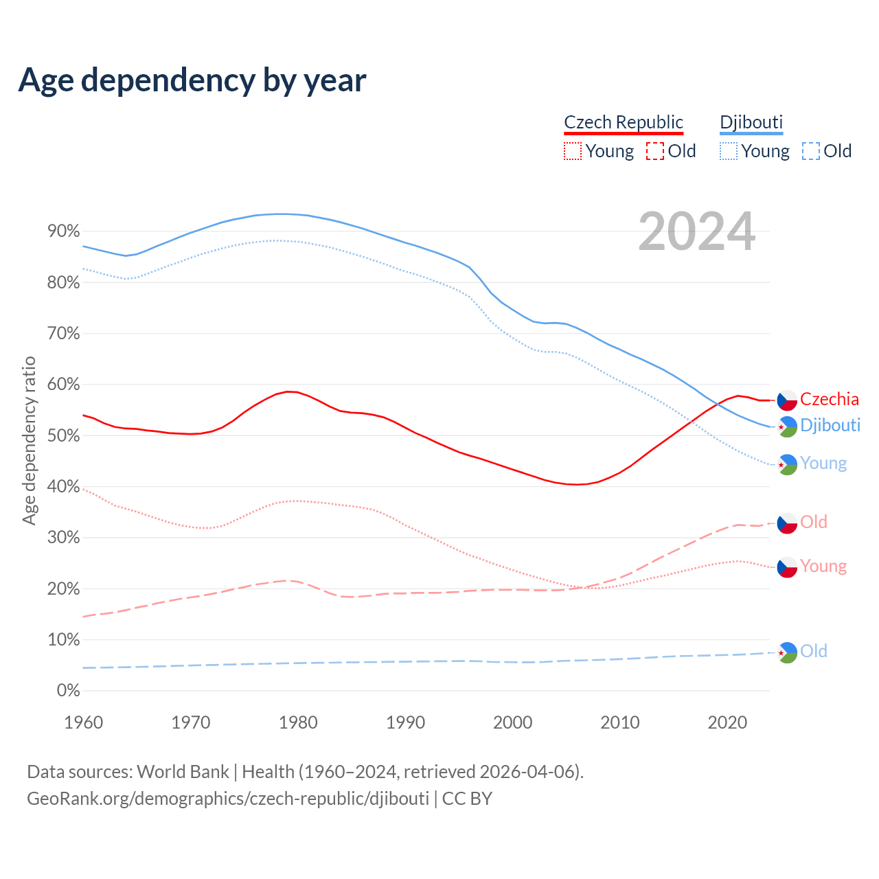- The Czech Republic is ranked 21/196 by median age (oldest to youngest) vs 129/196 for Djibouti.