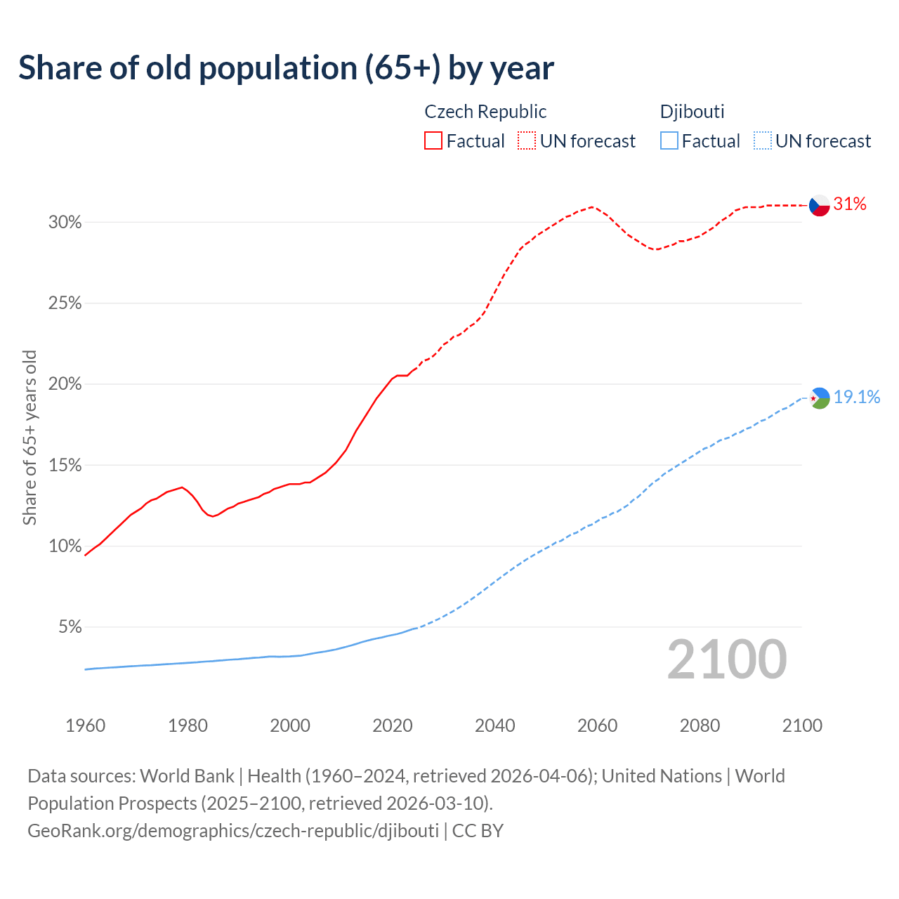 The share of older people aged 65 and over is 20.8% in the Czech Republic and 4.85% in Djibouti. Life expectancy in the Czech Republic compared to Djibouti .