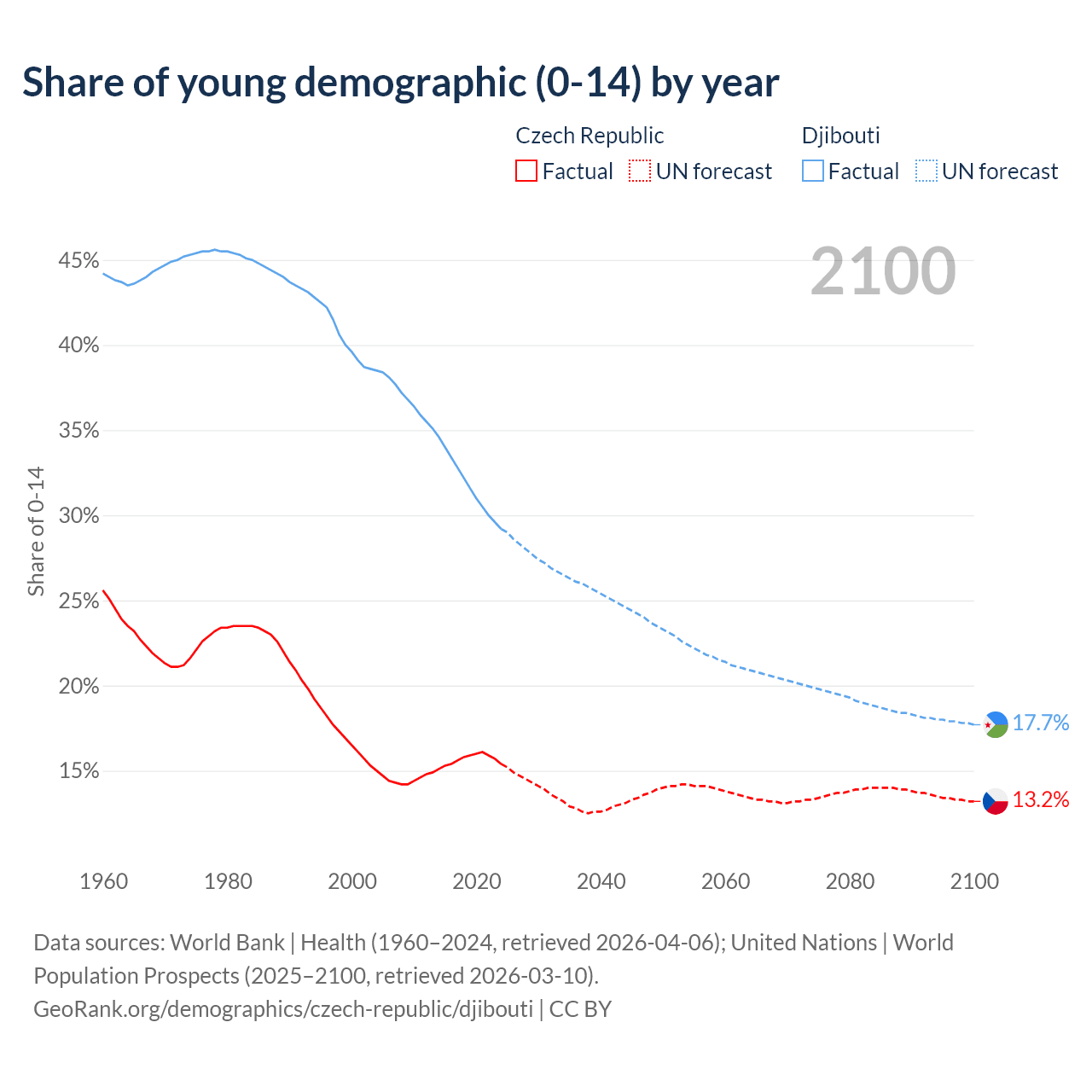 - The share of young demographic (0-15 years old) in the Czech Republic is 15.4% vs 29.2% in Djibouti.