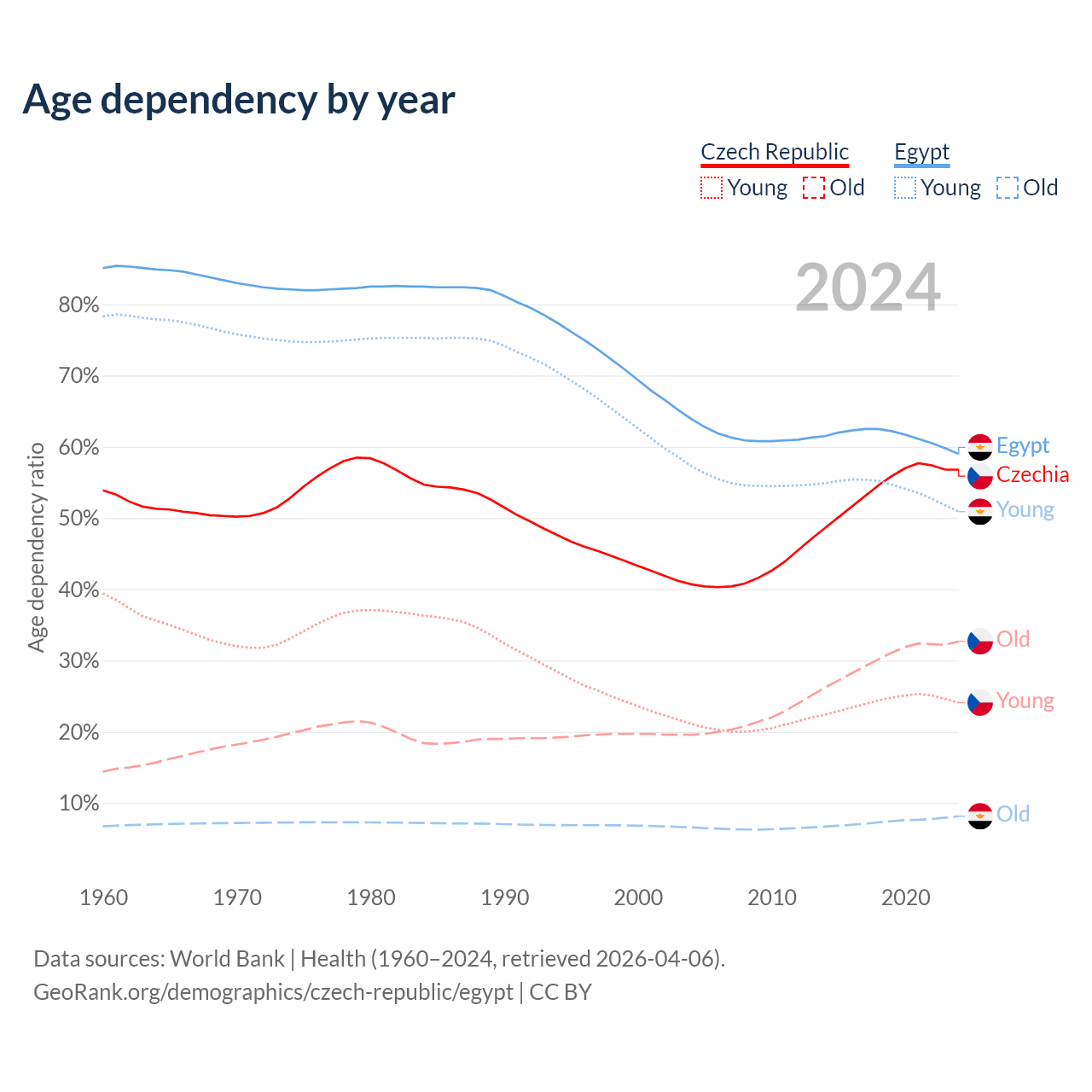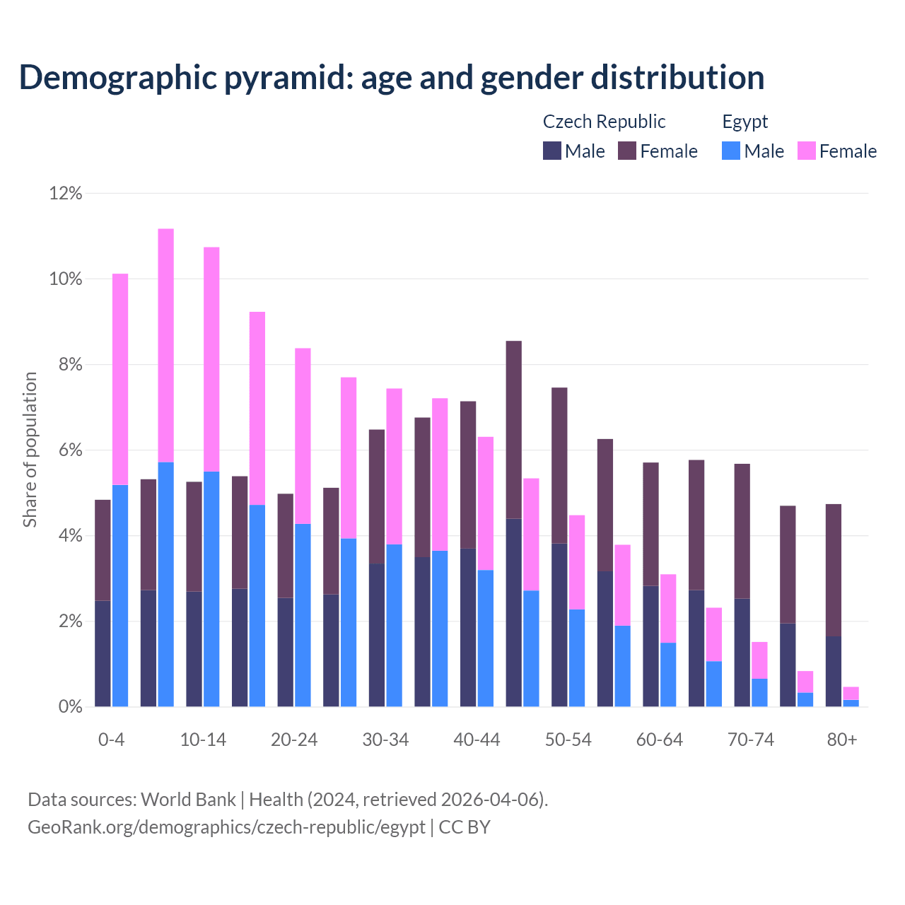 - The Czech Republic is ranked 21/196 by median age (oldest to youngest) vs 133/196 for Egypt.