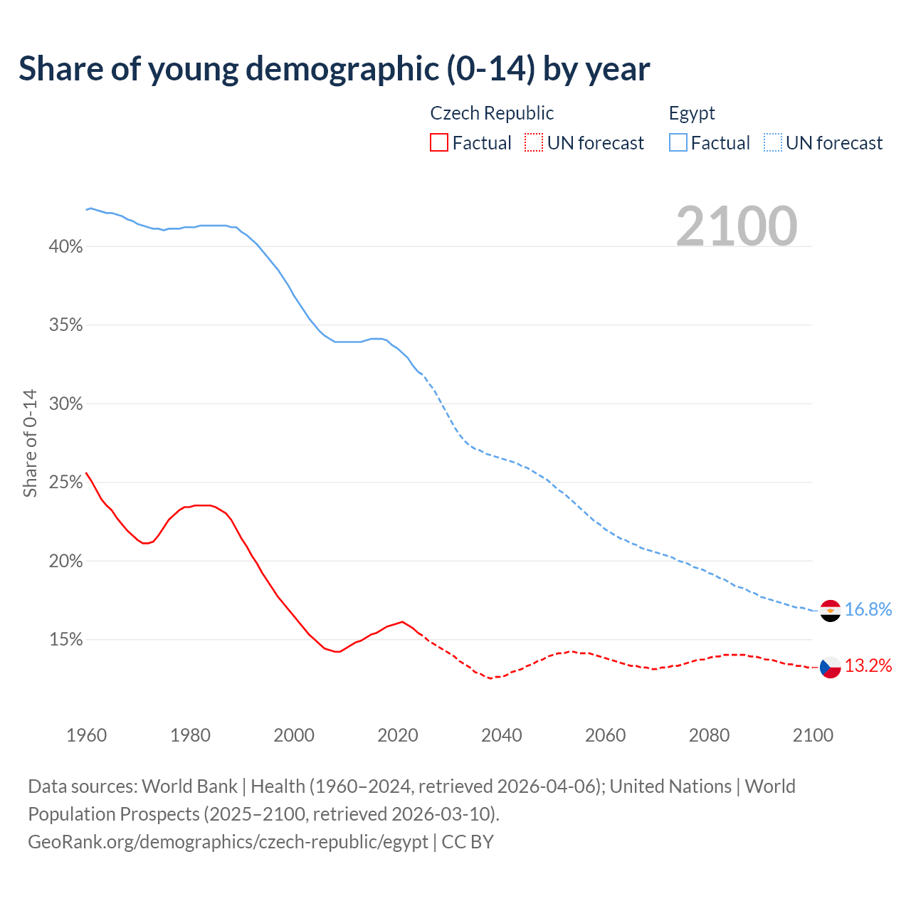 - The share of young demographic (0-15 years old) in the Czech Republic is 15.4% vs 32% in Egypt.