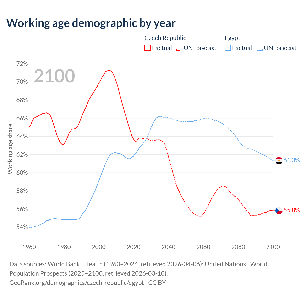 - The Czech Republic has 6.79M working age adults (aged 15-64) vs 75.9M in Egypt.