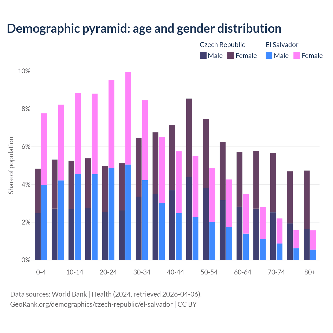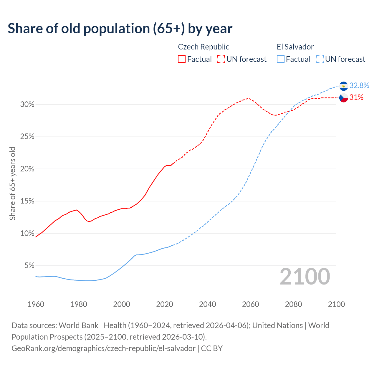 - The share of old-age demographic (65+) in the Czech Republic is 20.8% vs 8.15% in El Salvador.