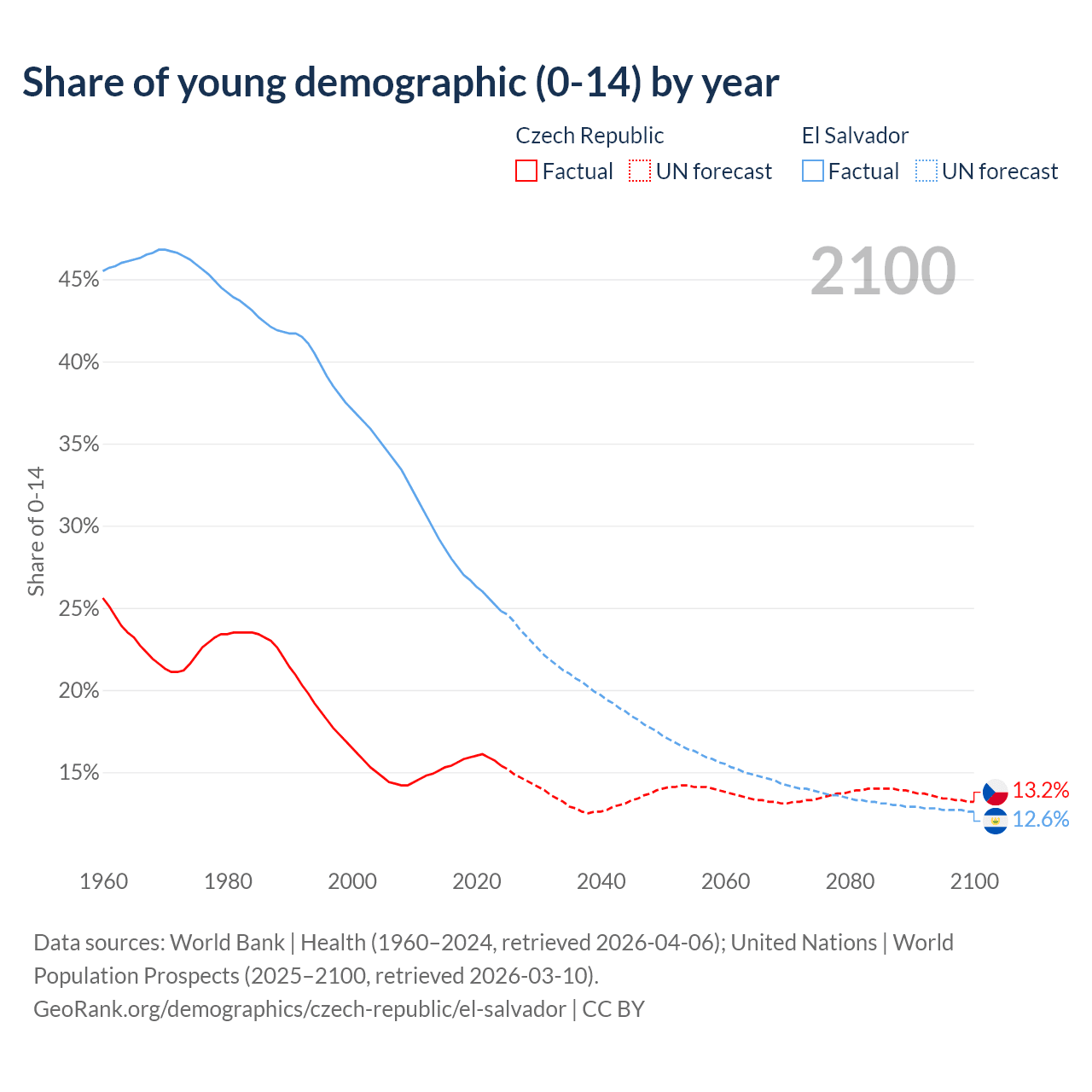 - The share of young demographic (0-15 years old) in the Czech Republic is 15.4% vs 24.8% in El Salvador.