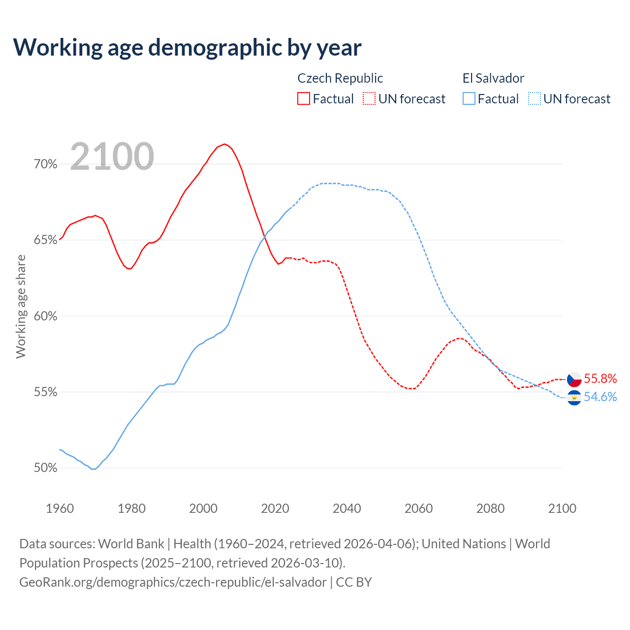 Median age Czech Republic vs El Salvador, 1960-2100
