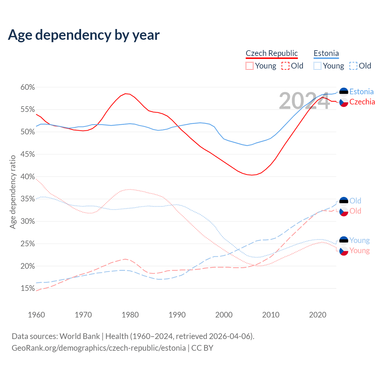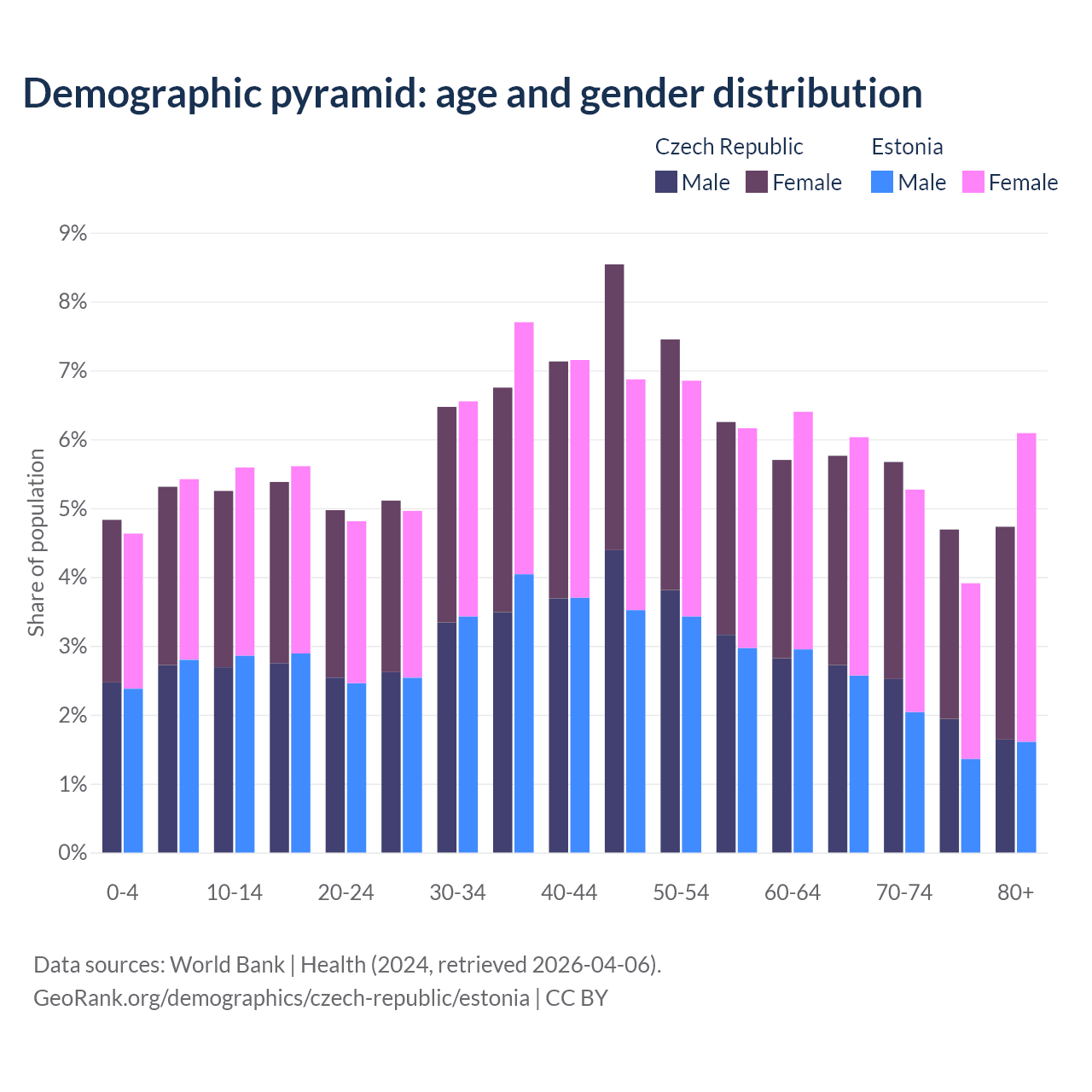 - The Czech Republic is ranked 21/196 by median age (oldest to youngest) vs 25/196 for Estonia.