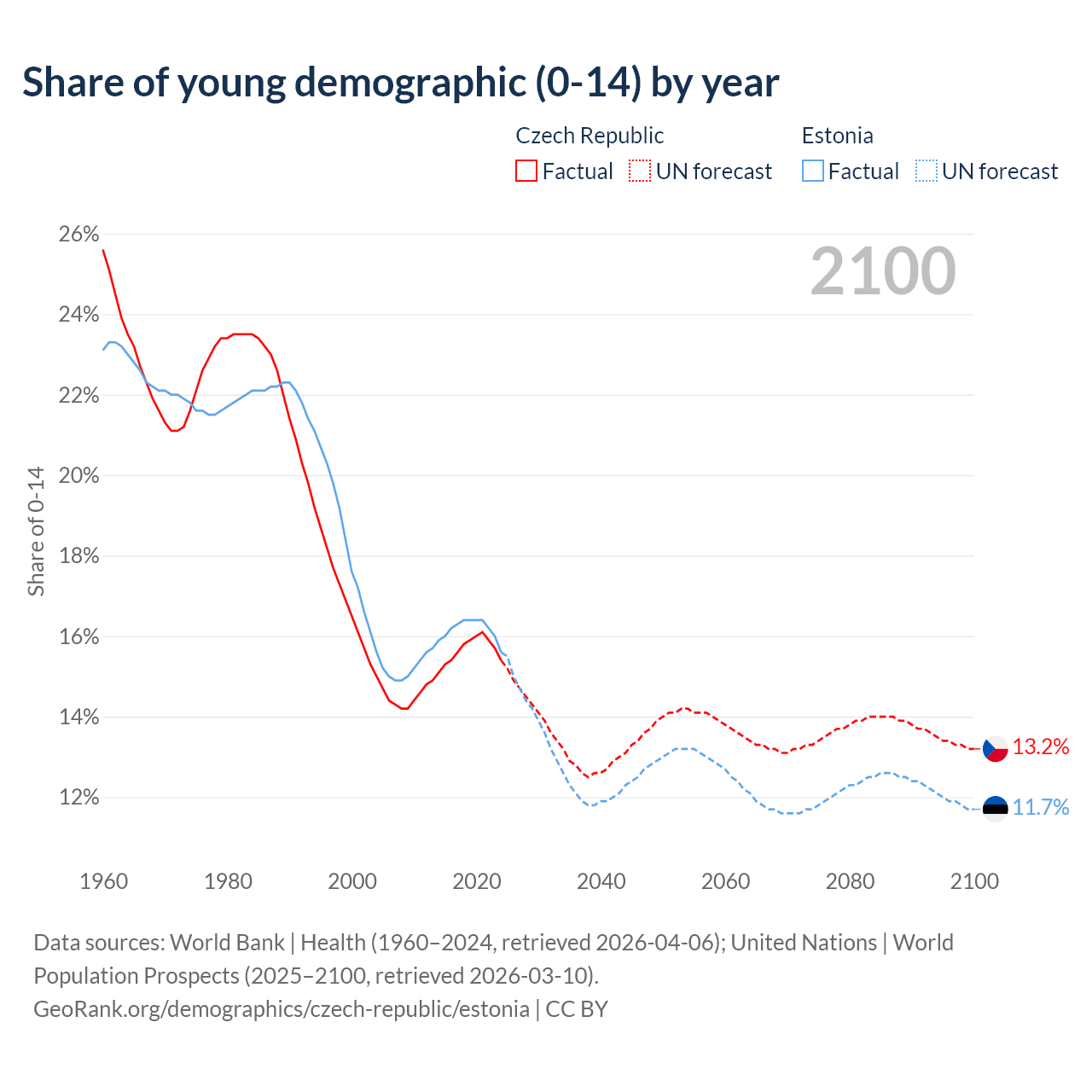 - The share of young demographic (0-15 years old) in the Czech Republic is 15.4% vs 15.6% in Estonia.