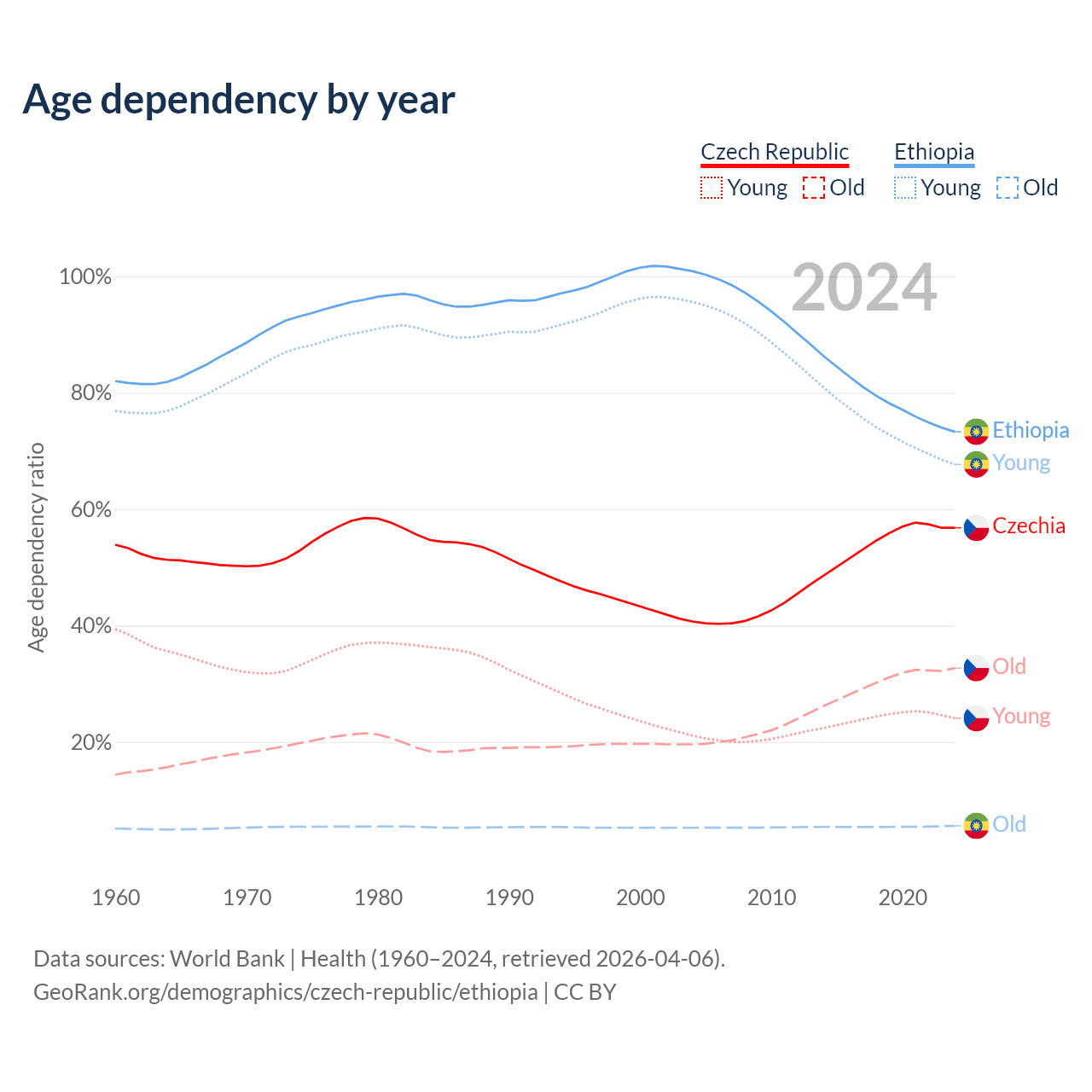 - The share of old-age demographic (65+) in the Czech Republic is 20.8% vs 3.23% in Ethiopia.