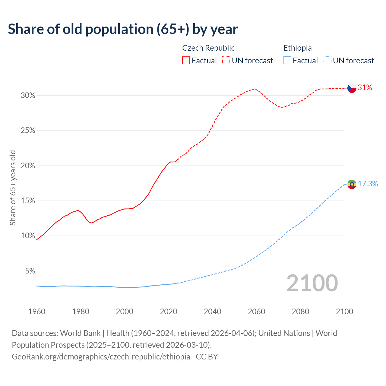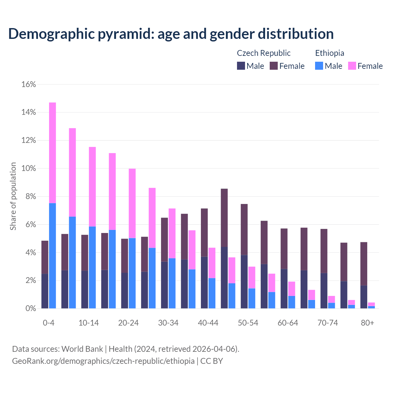 The share of older people aged 65 and over is 20.8% in the Czech Republic and 3.23% in Ethiopia. Life expectancy in the Czech Republic compared to Ethiopia .