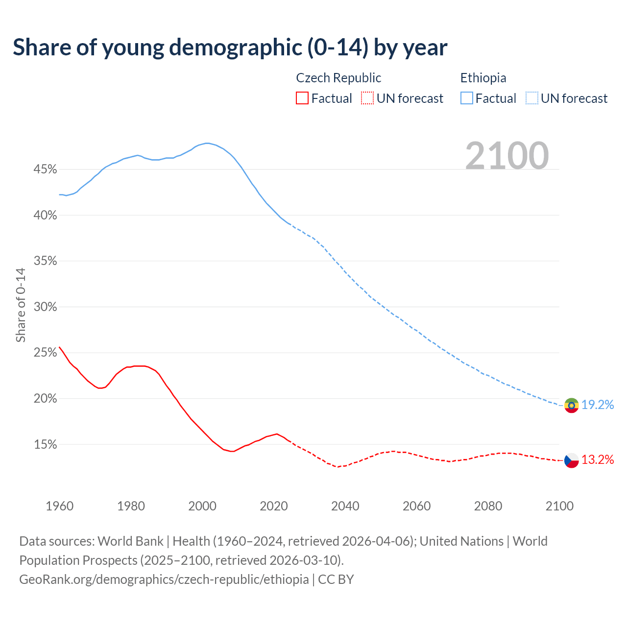 - The share of young demographic (0-15 years old) in the Czech Republic is 15.4% vs 39.1% in Ethiopia.