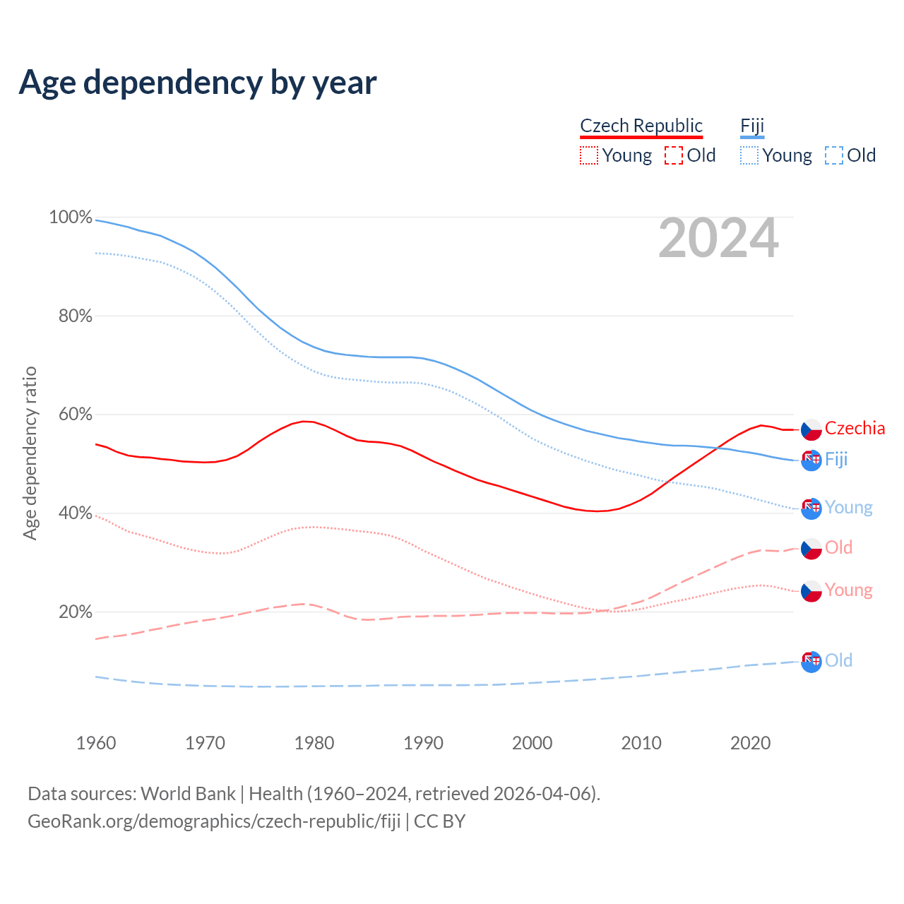 - The share of old-age demographic (65+) in the Czech Republic is 20.8% vs 6.49% in Fiji.