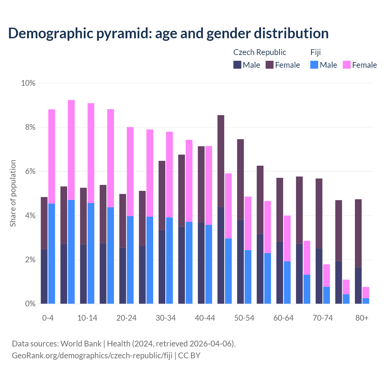 - As of 2026, the population of the Czech Republic is 10.6M vs 939K in Fiji - 11.3 times difference.