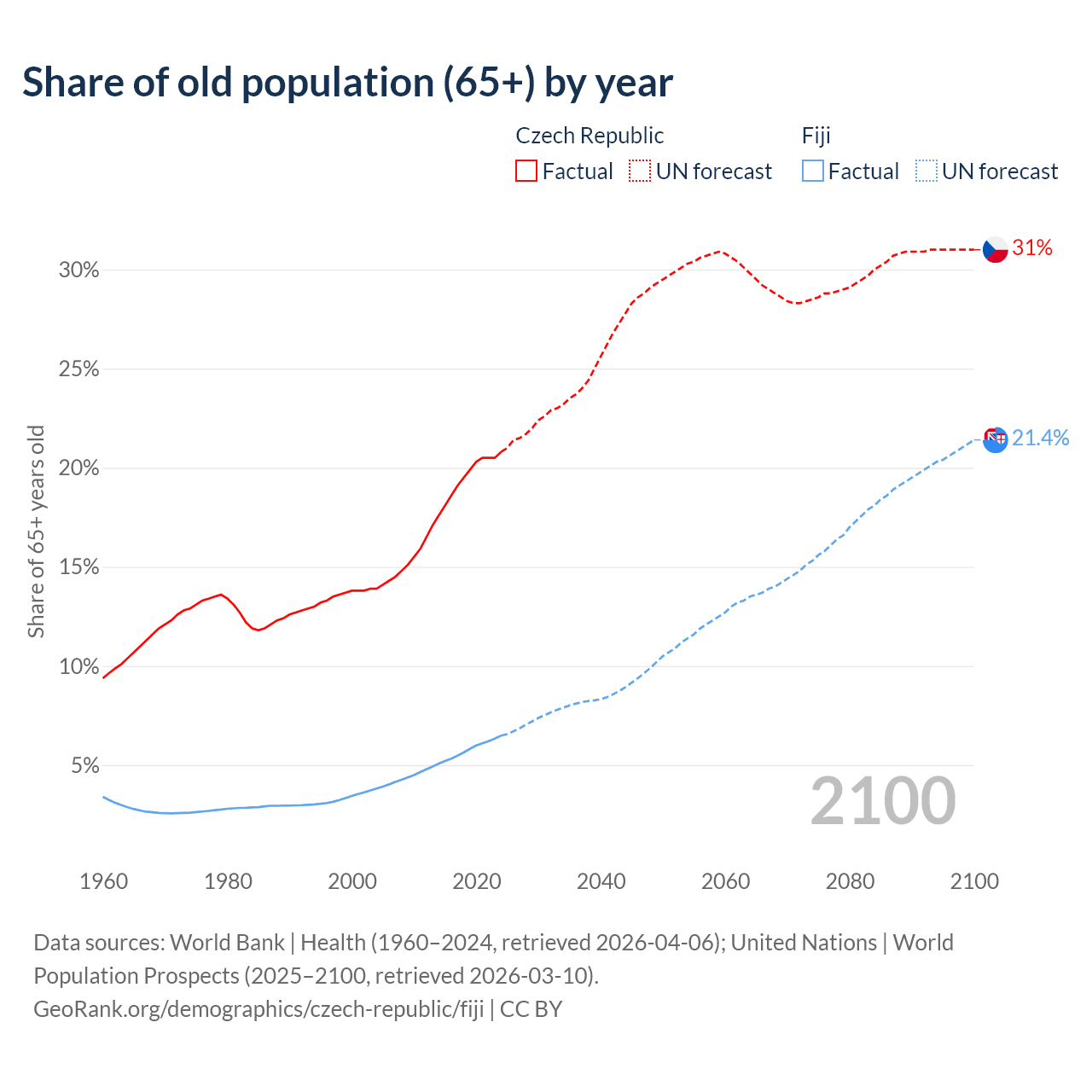 The share of older people aged 65 and over is 20.8% in the Czech Republic and 6.49% in Fiji. Life expectancy in the Czech Republic compared to Fiji .