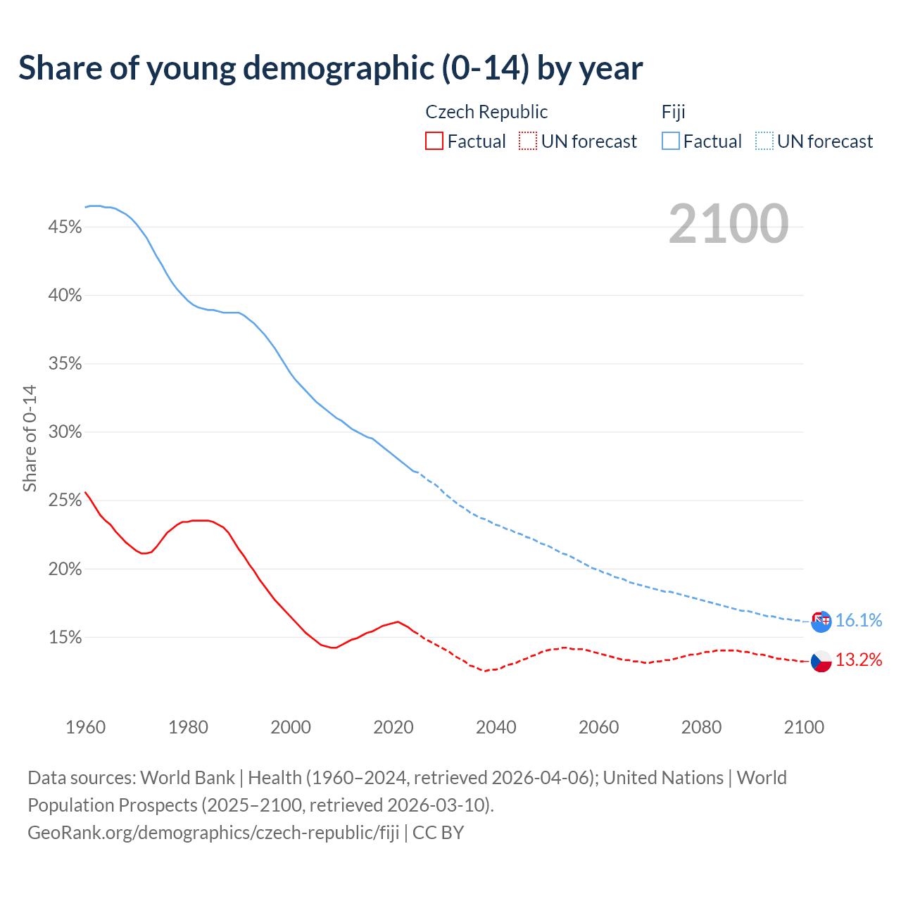- The share of young demographic (0-15 years old) in the Czech Republic is 15.4% vs 27.1% in Fiji.