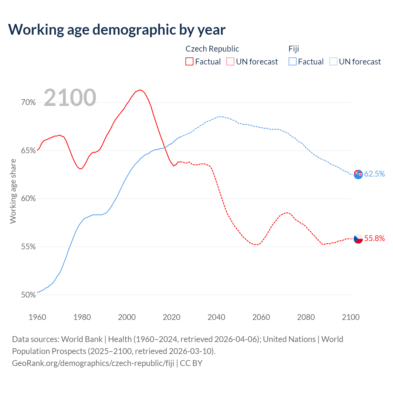- The Czech Republic has 6.79M working age adults (aged 15-64) vs 623K in Fiji.