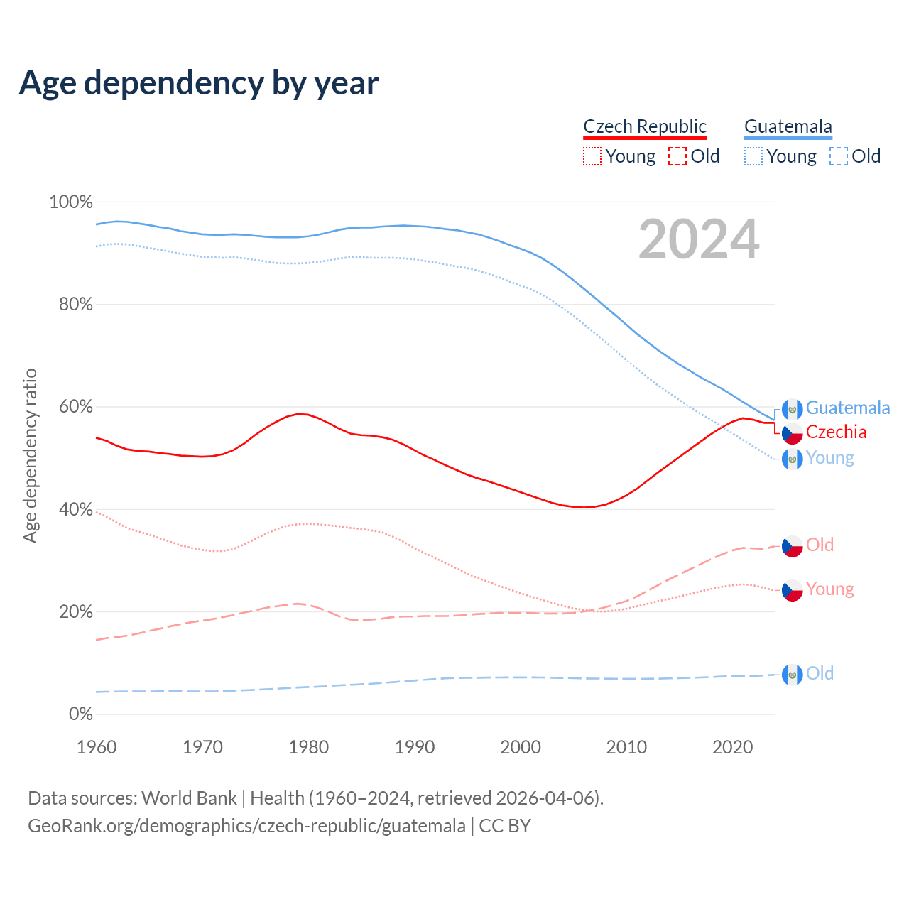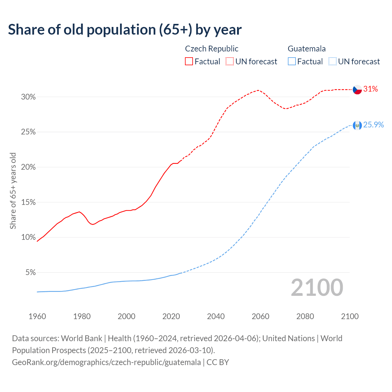 - The share of old-age demographic (65+) in the Czech Republic is 20.8% vs 4.85% in Guatemala.