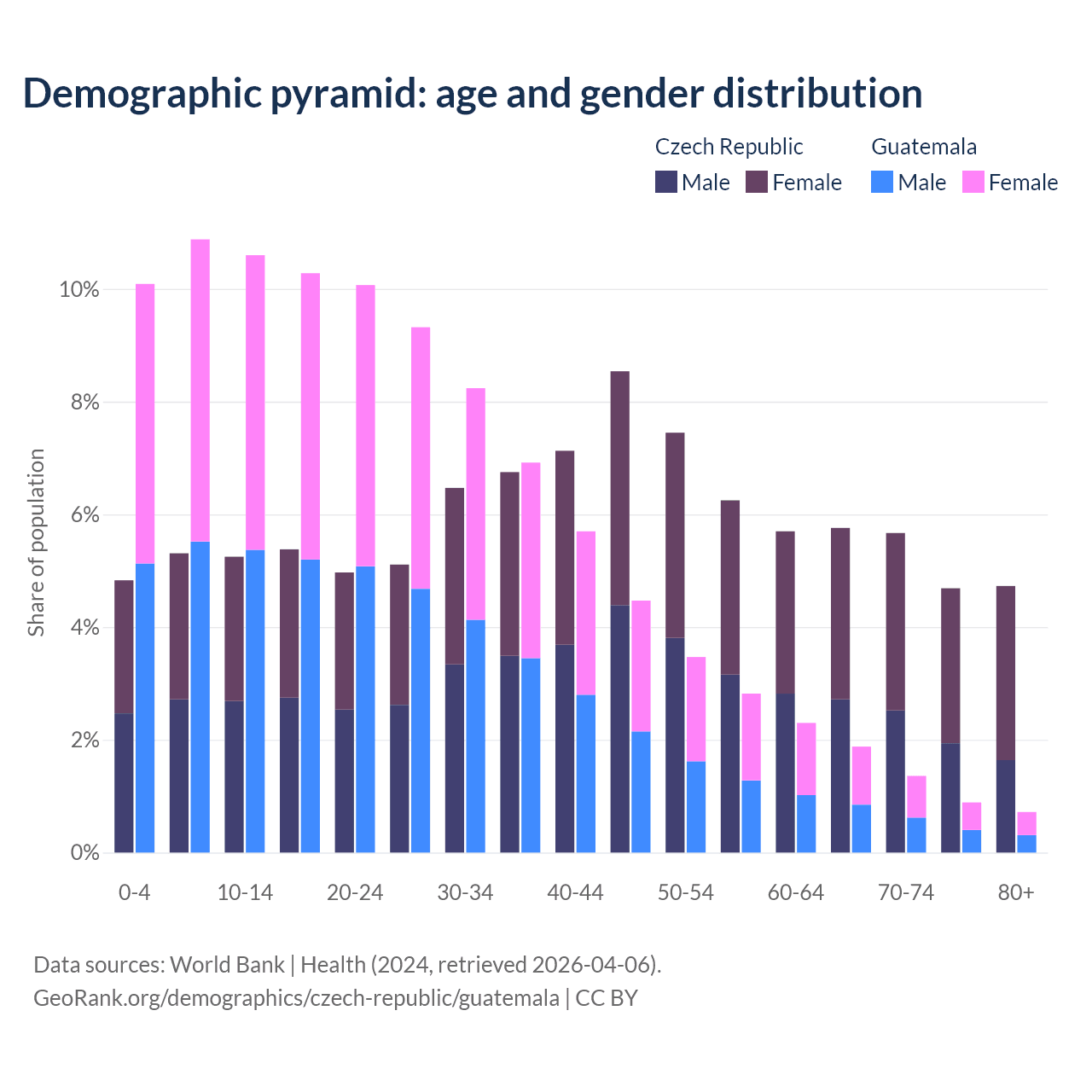 - As of 2026, the population of the Czech Republic is 10.6M vs 19M in Guatemala - 1.79 times difference.