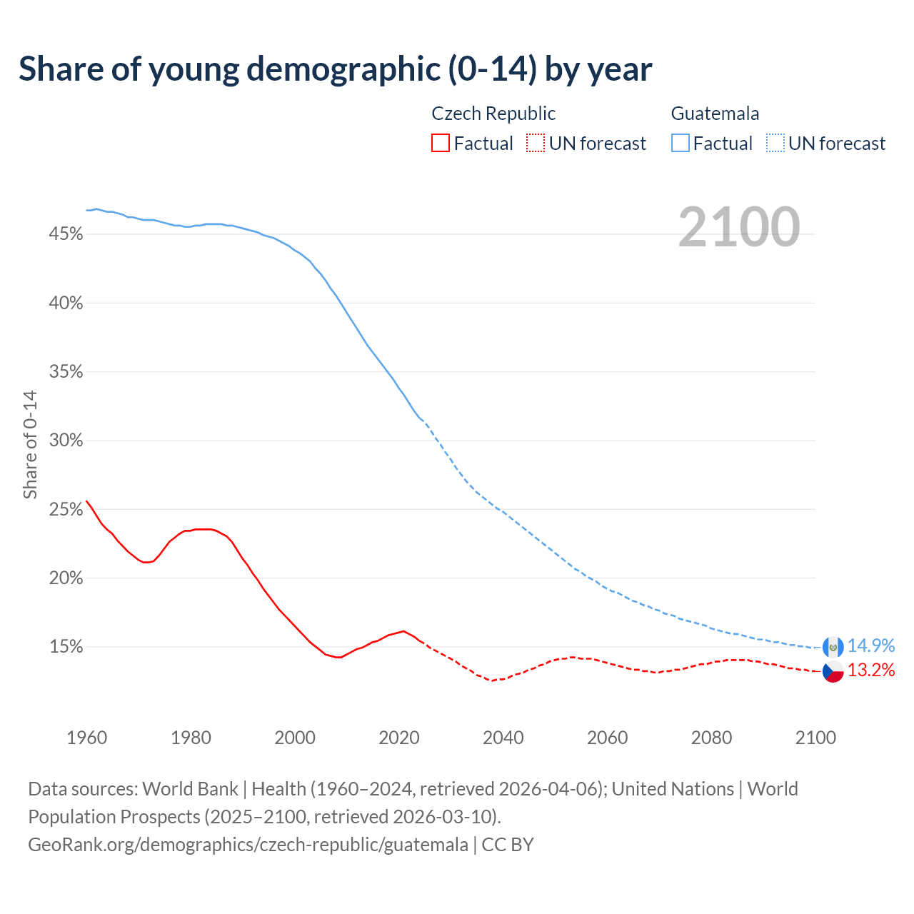 - The share of young demographic (0-15 years old) in the Czech Republic is 15.4% vs 31.6% in Guatemala.