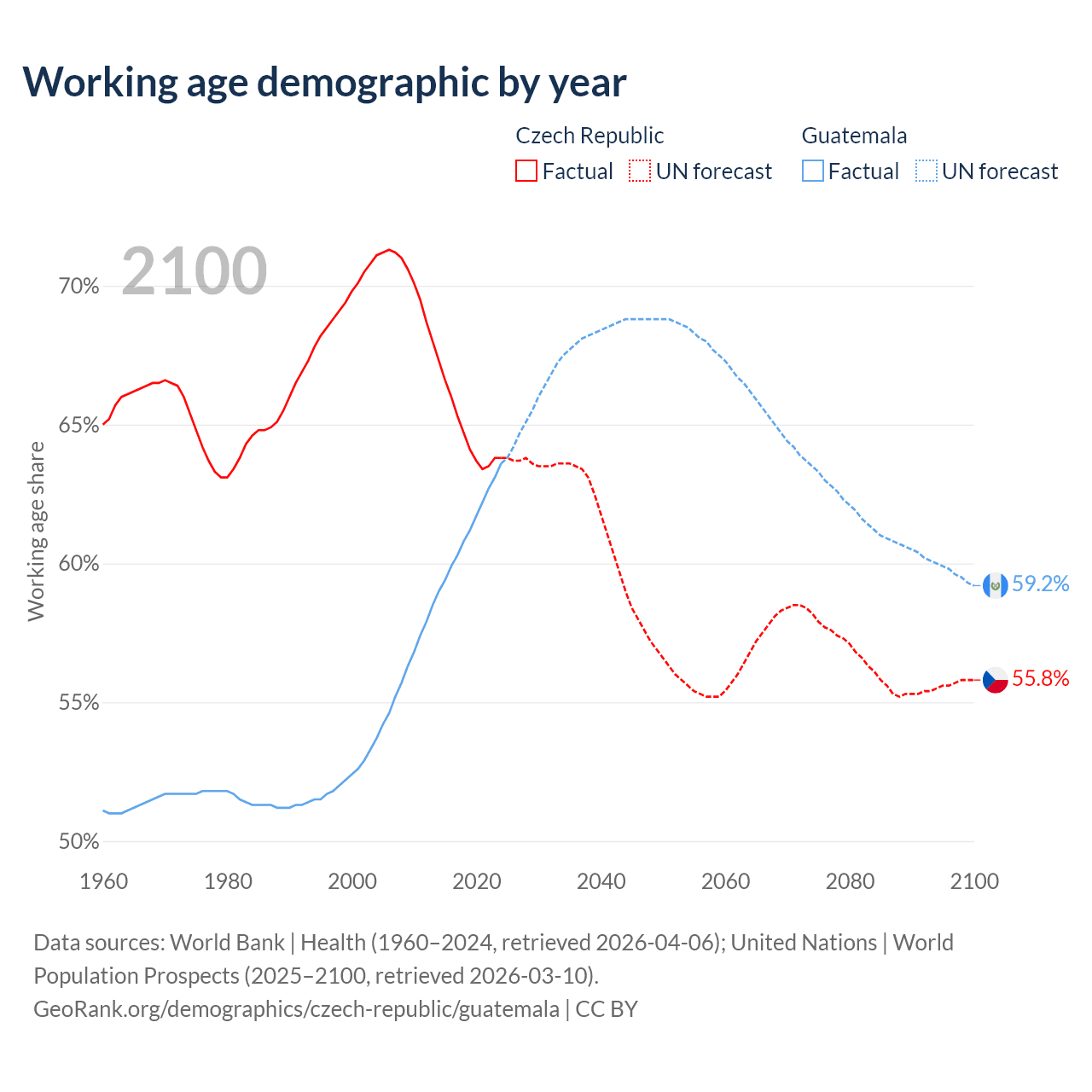 - The Czech Republic has 6.79M working age adults (aged 15-64) vs 12.1M in Guatemala.