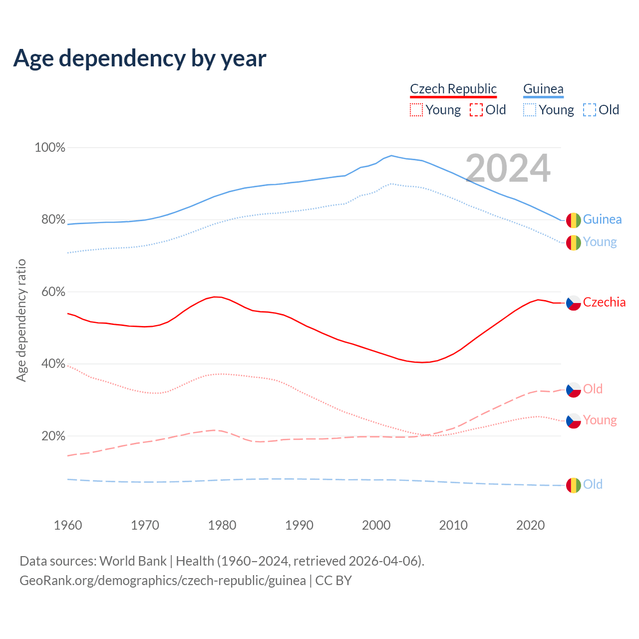 - The Czech Republic is ranked 21/196 by median age (oldest to youngest) vs 176/196 for Guinea.