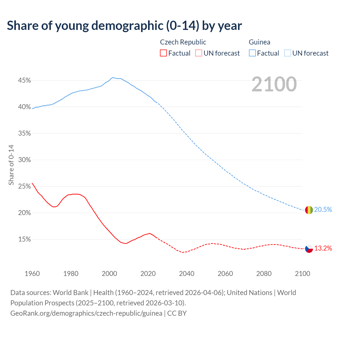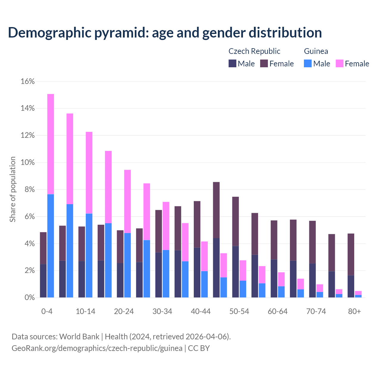 - The share of young demographic (0-15 years old) in the Czech Republic is 15.4% vs 40.9% in Guinea.