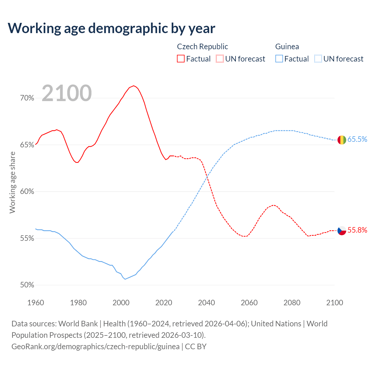 Median age Czech Republic vs Guinea, 1960-2100
