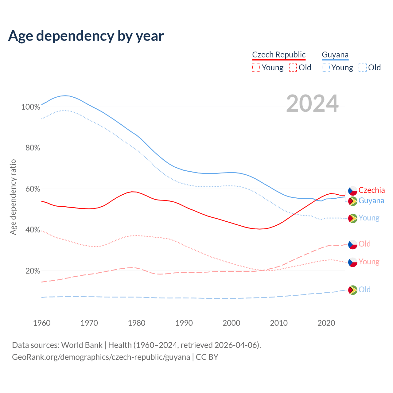 - The Czech Republic is ranked 21/196 by median age (oldest to youngest) vs 122/196 for Guyana.
