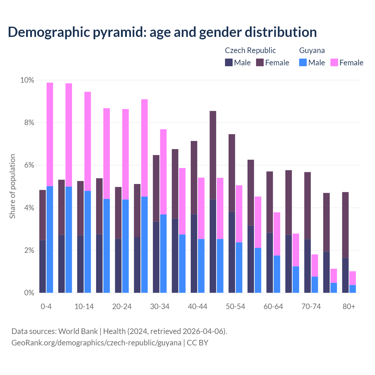 - The share of old-age demographic (65+) in the Czech Republic is 20.8% vs 6.73% in Guyana.