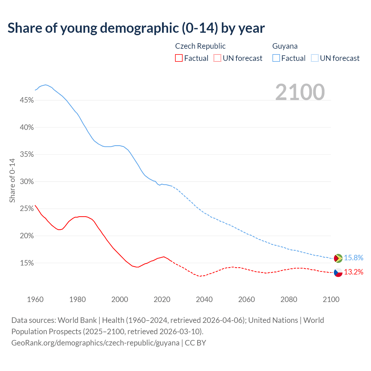 - The share of young demographic (0-15 years old) in the Czech Republic is 15.4% vs 29.2% in Guyana.