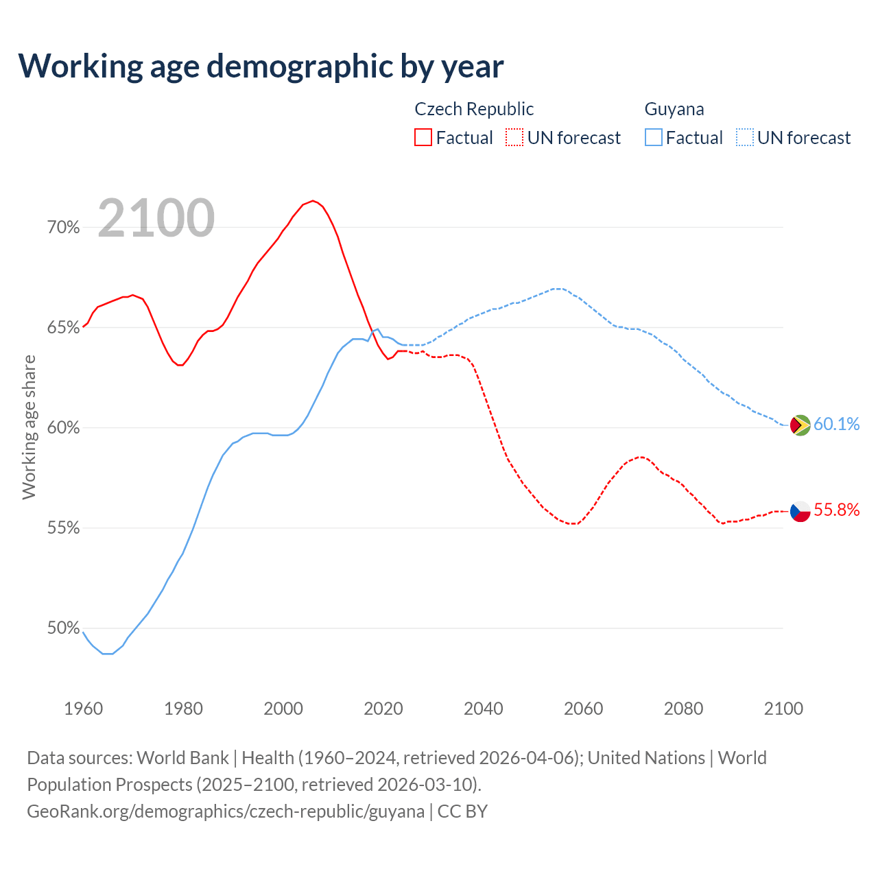 Median age Czech Republic vs Guyana, 1960-2100