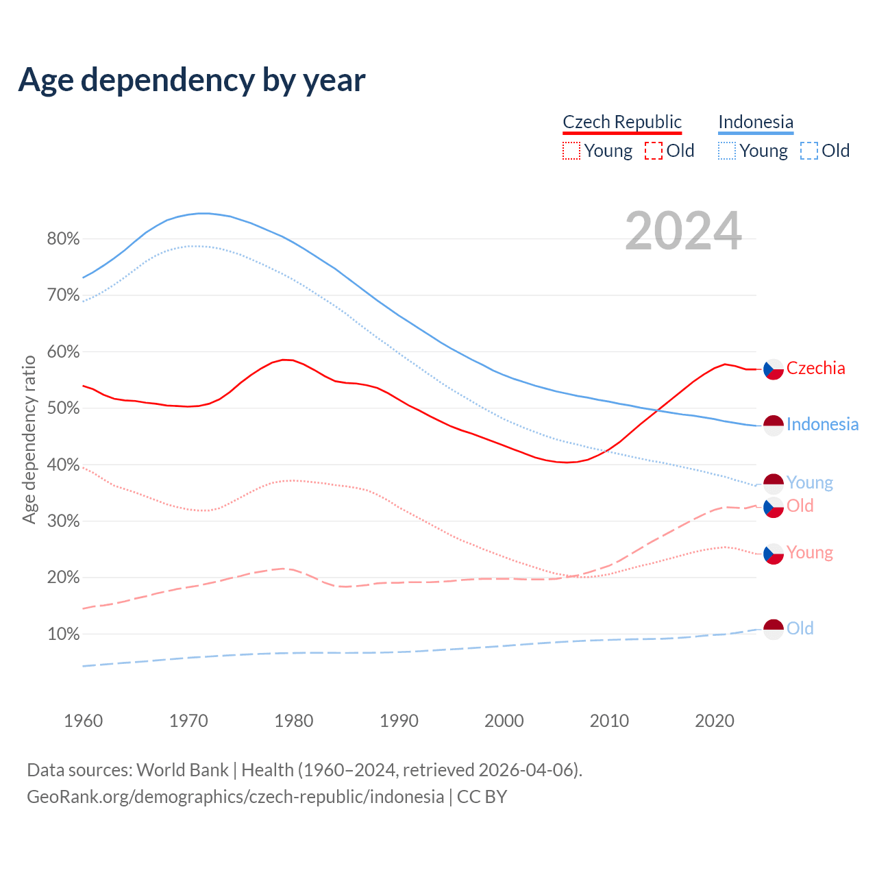 - The Czech Republic is ranked 21/196 by median age (oldest to youngest) vs 93/196 for Indonesia.