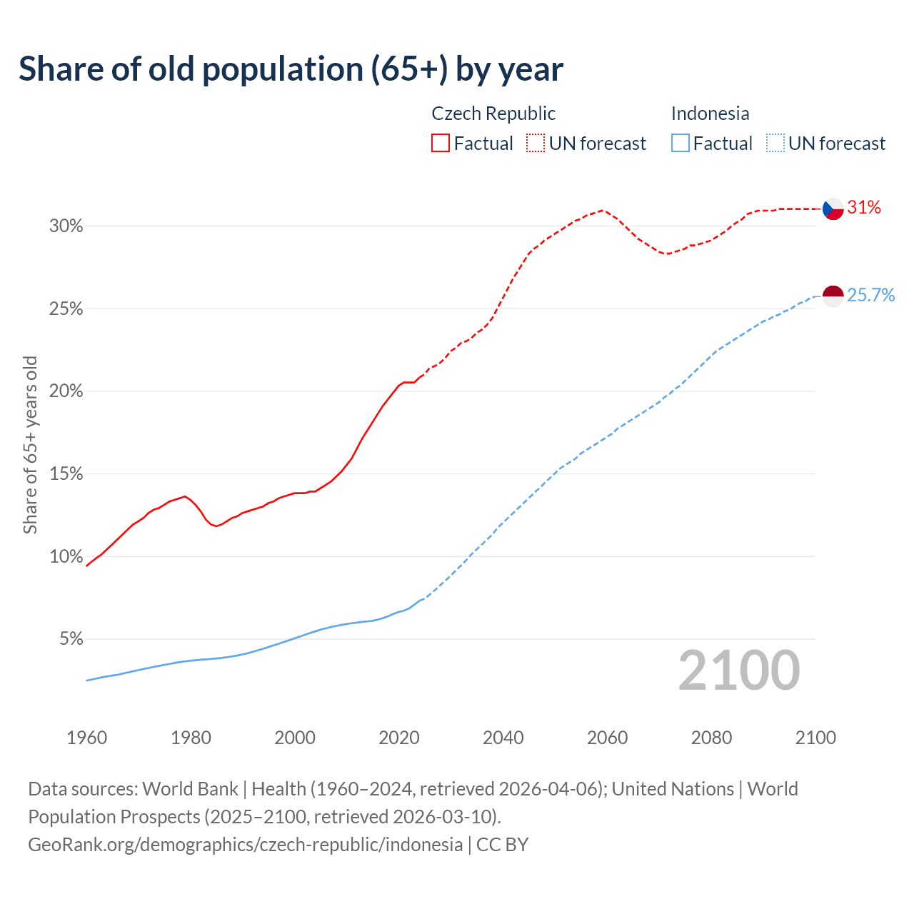 The share of older people aged 65 and over is 20.8% in the Czech Republic and 7.29% in Indonesia. Life expectancy in the Czech Republic compared to Indonesia .