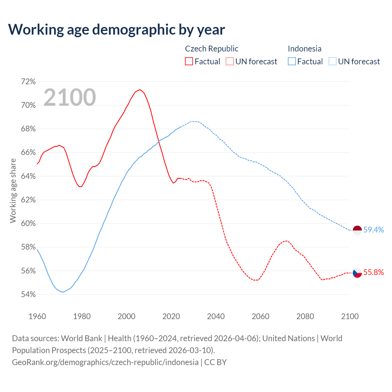 - The Czech Republic has 6.79M working age adults (aged 15-64) vs 197M in Indonesia.