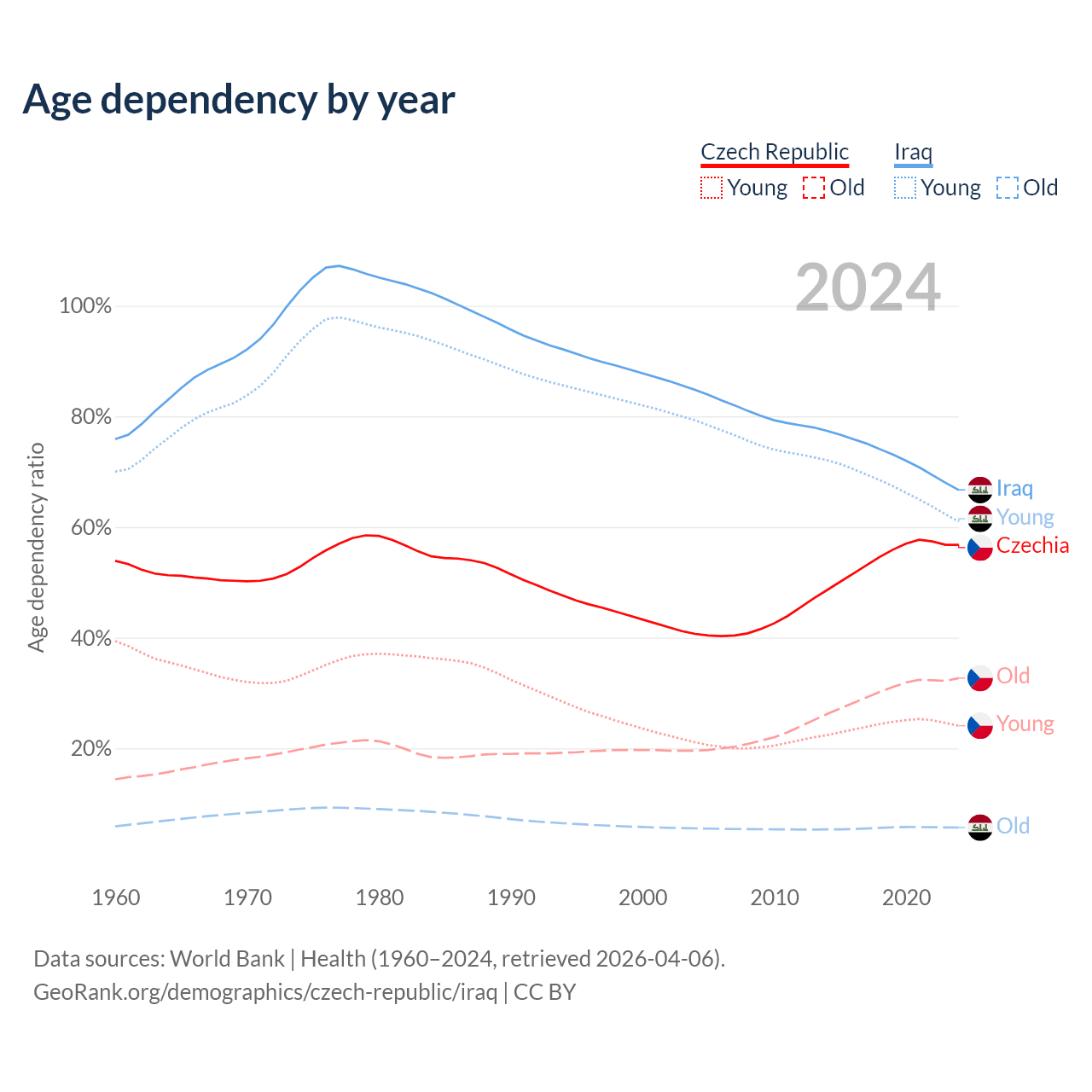 - The Czech Republic is ranked 21/196 by median age (oldest to youngest) vs 151/196 for Iraq.