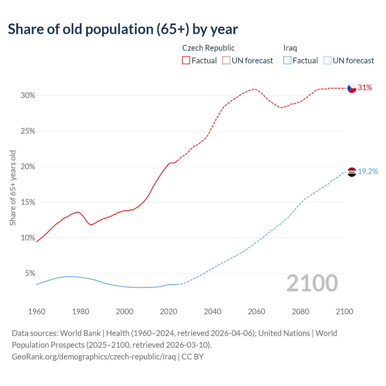 The share of older people aged 65 and over is 20.8% in the Czech Republic and 3.41% in Iraq. Life expectancy in the Czech Republic compared to Iraq .