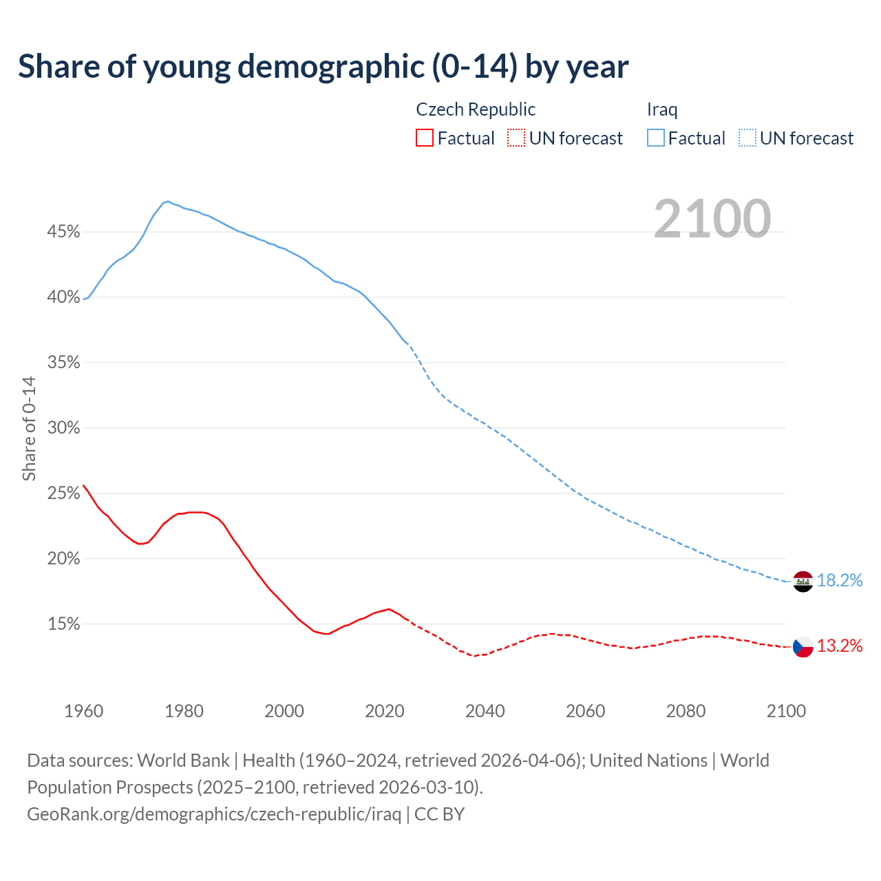 - The share of young demographic (0-15 years old) in the Czech Republic is 15.4% vs 36.6% in Iraq.