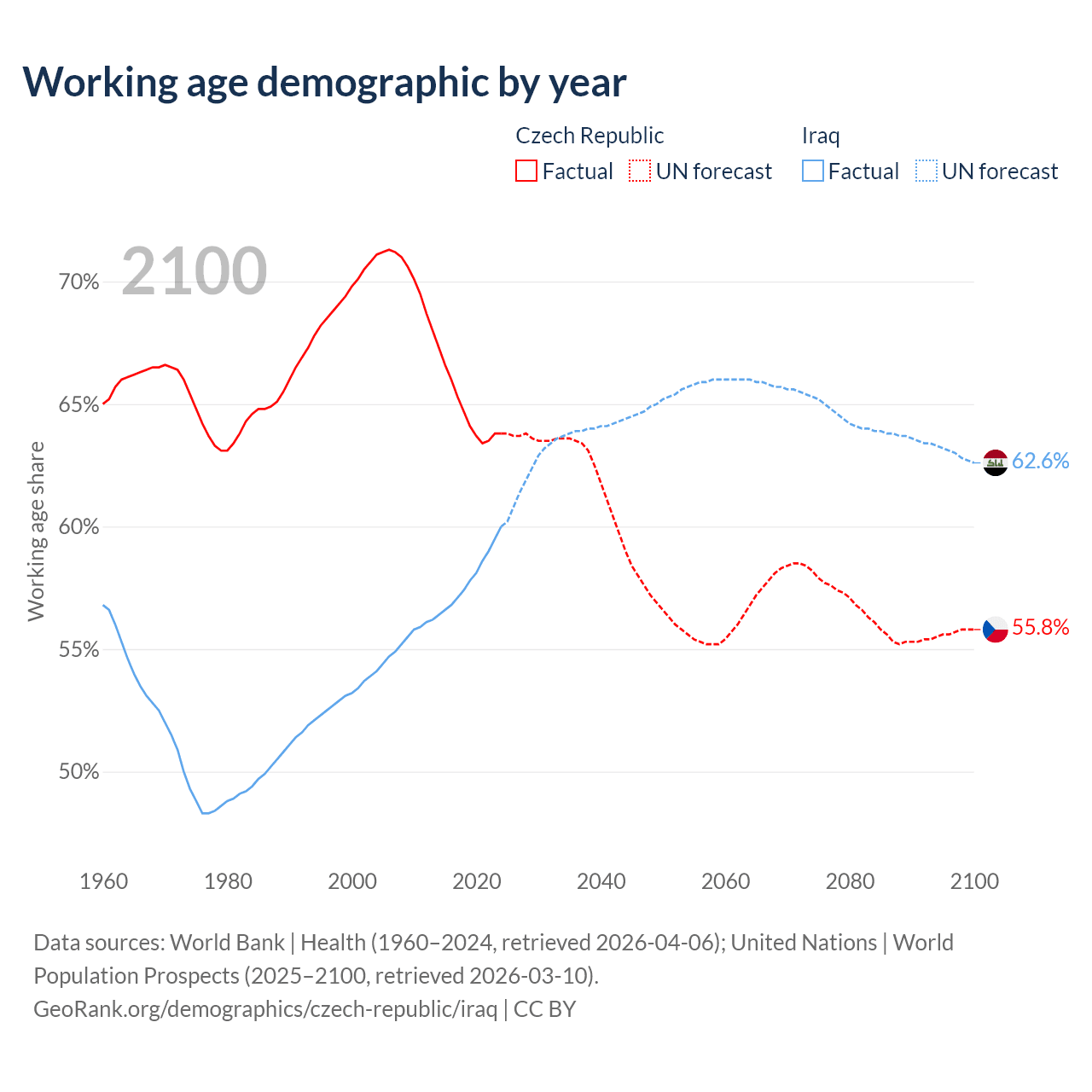 Median age Czech Republic vs Iraq, 1960-2100