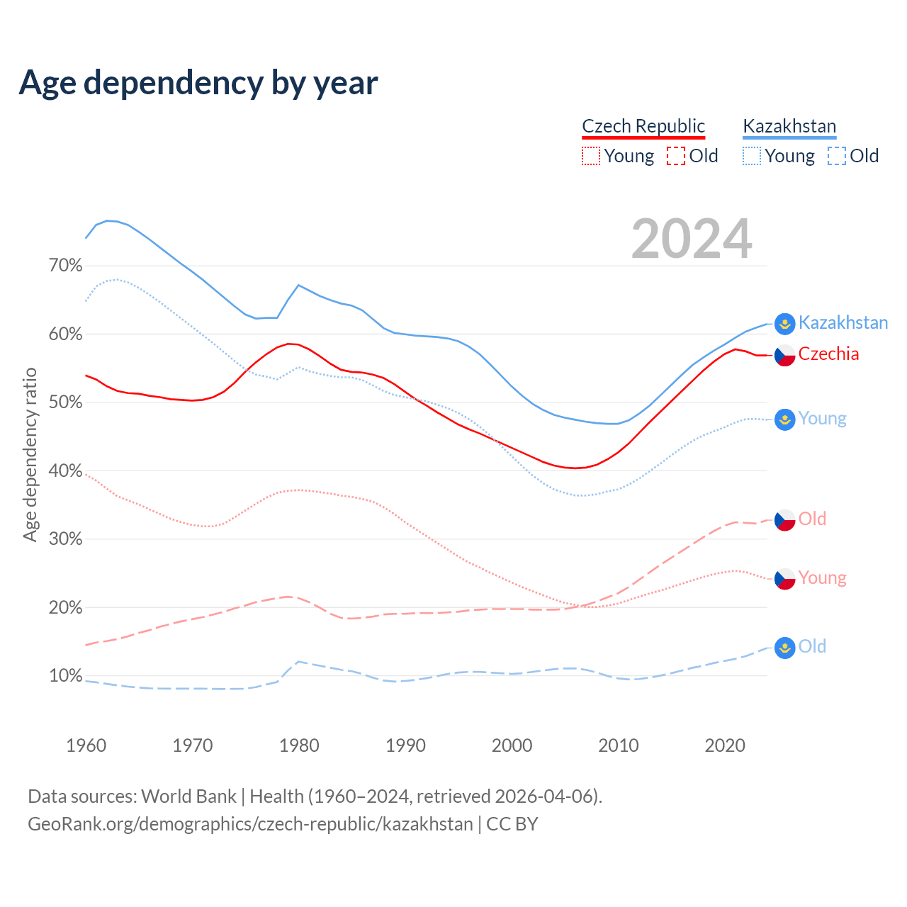 Data sources: World Bank | Health (1960–2024, retrieved 2026-04-06); U.S. Census Bureau (1960–2024, retrieved 2026-02-08).