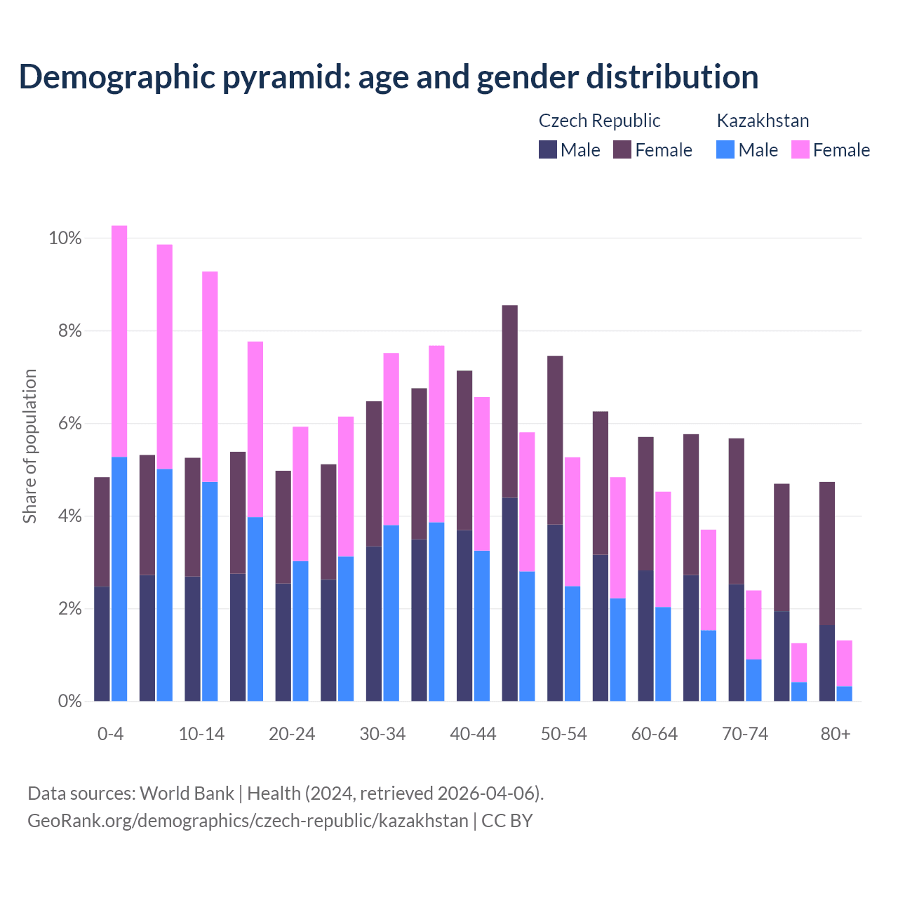 - The Czech Republic is ranked 21/196 by median age (oldest to youngest) vs 99/196 for Kazakhstan.