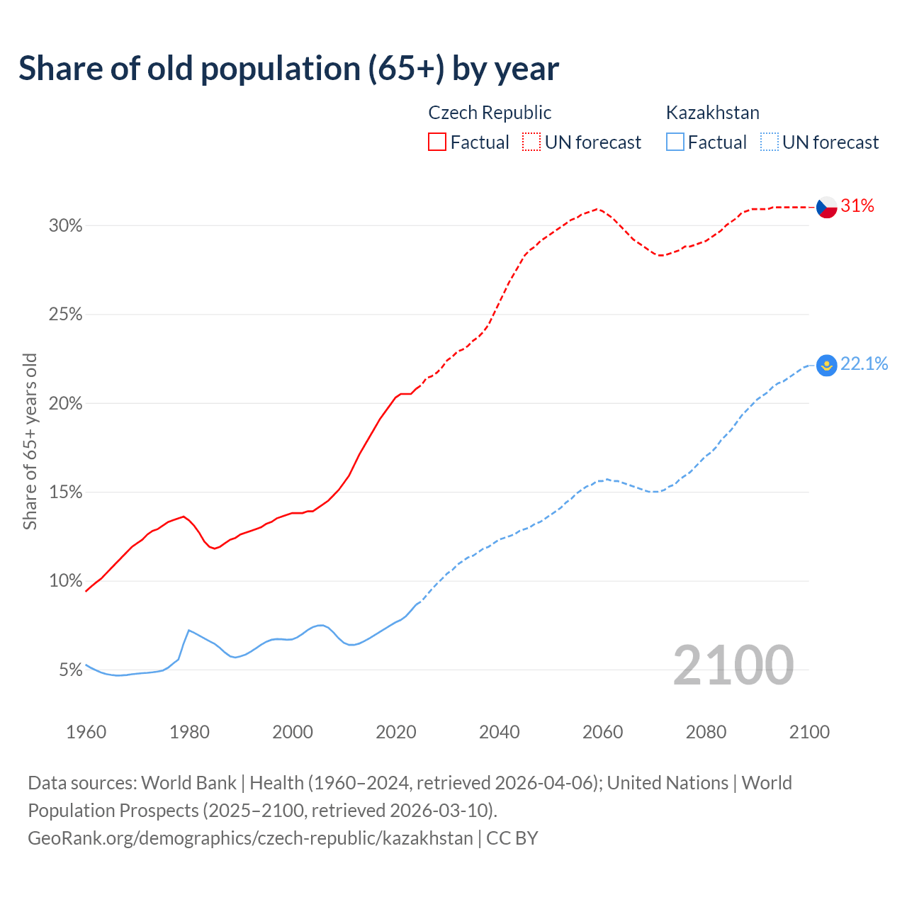 The share of older people aged 65 and over is 20.8% in the Czech Republic and 8.65% in Kazakhstan. Life expectancy in the Czech Republic compared to Kazakhstan .