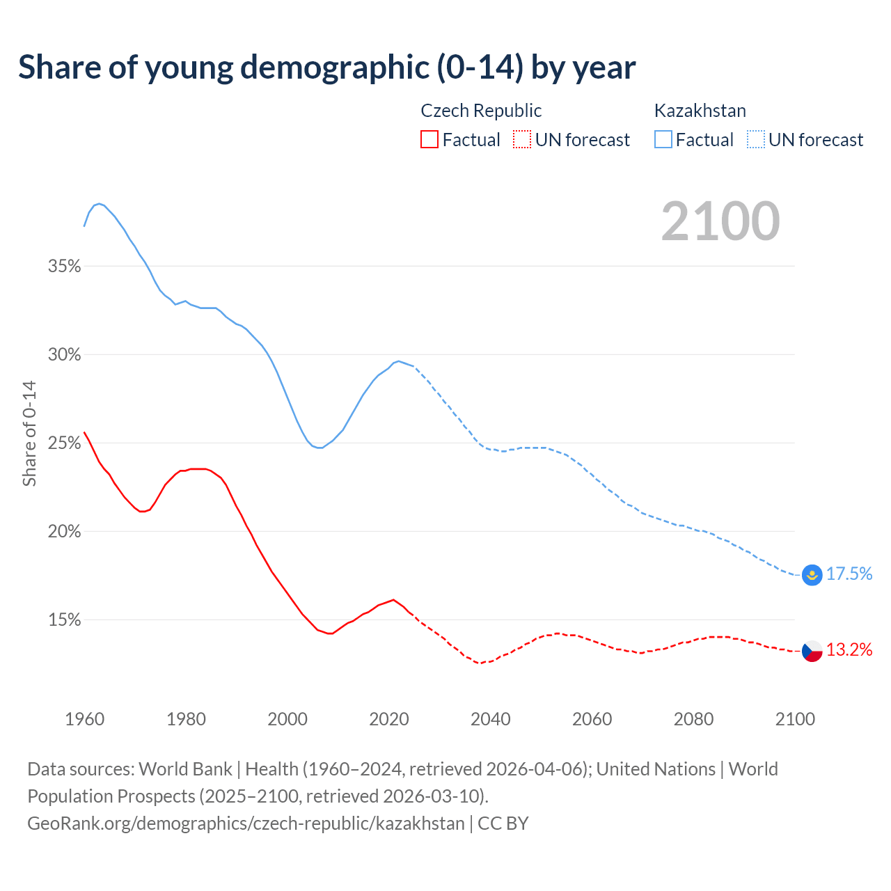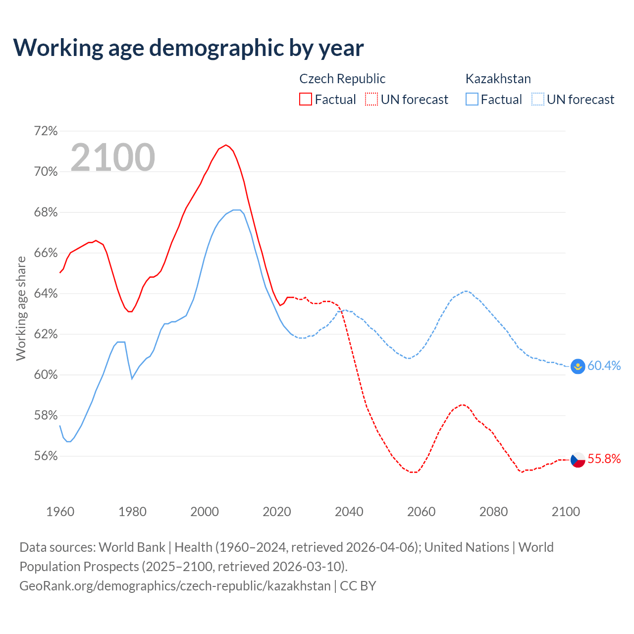 Median age Czech Republic vs Kazakhstan, 1960-2100
