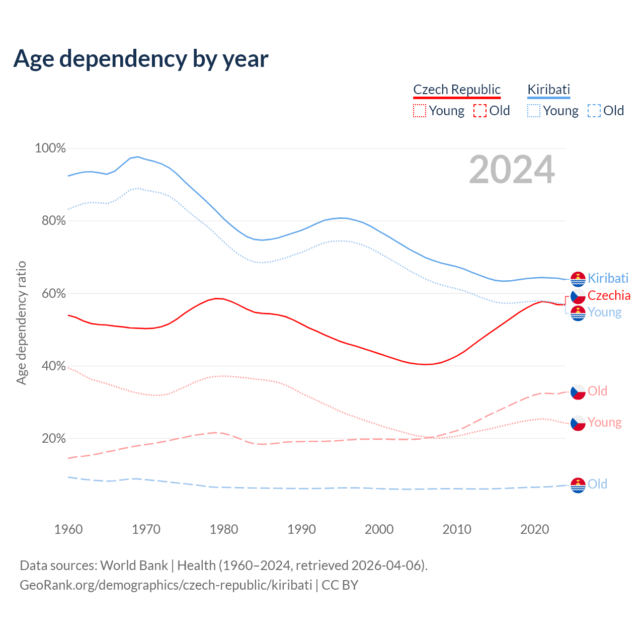 - The share of old-age demographic (65+) in the Czech Republic is 20.8% vs 4.24% in Kiribati.