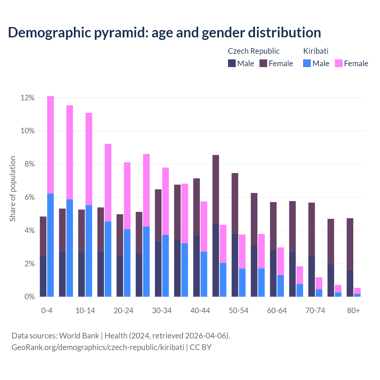 - As of 2026, the population of the Czech Republic is 10.6M vs 139K in Kiribati - 76.6 times difference.
