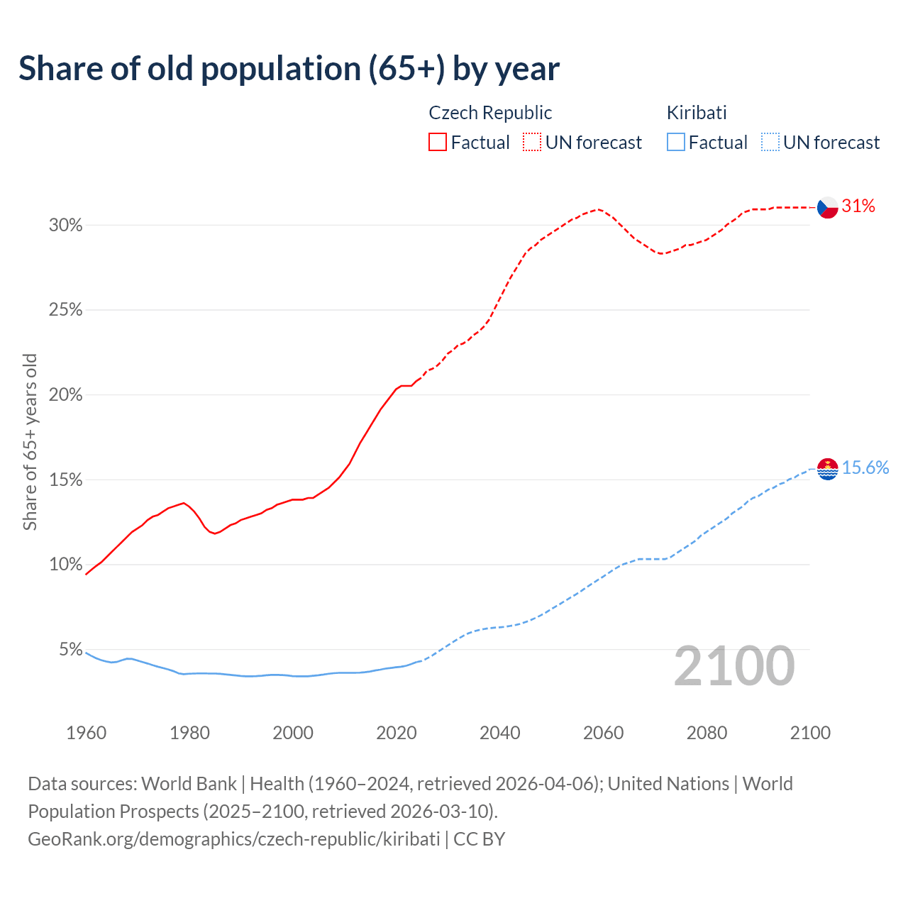 The share of older people aged 65 and over is 20.8% in the Czech Republic and 4.24% in Kiribati. Life expectancy in the Czech Republic compared to Kiribati .