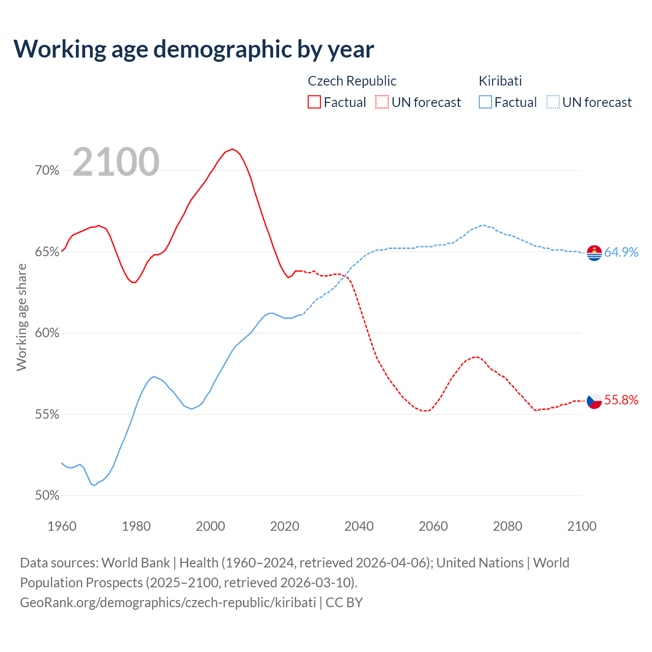 - The Czech Republic has 6.79M working age adults (aged 15-64) vs 84.9K in Kiribati.