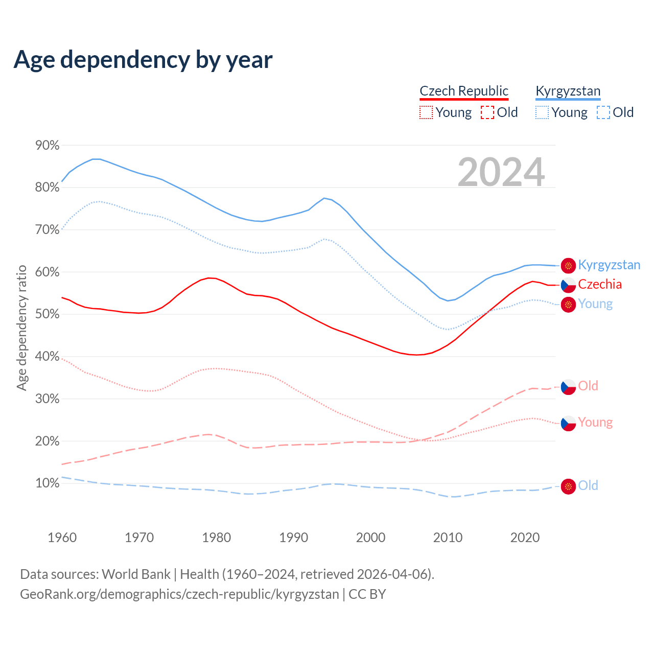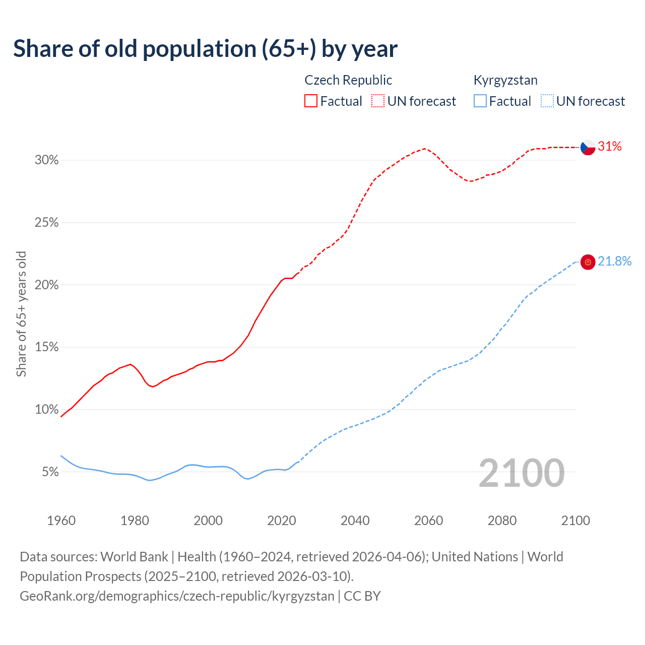 - The share of old-age demographic (65+) in the Czech Republic is 20.8% vs 5.68% in Kyrgyzstan.